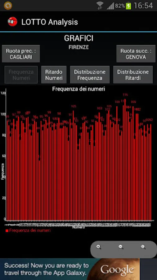 The numbers of the last draw are shown on all reels, the UPDATE ARCHIVE button is used to update the draws from the internet, the EXTRACTIONS button to go to the screen of the previous draws, the STATISTICS button to switch to the frequent and late numbers screen and the GRAPHICS button to switch to the graphs.