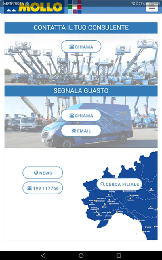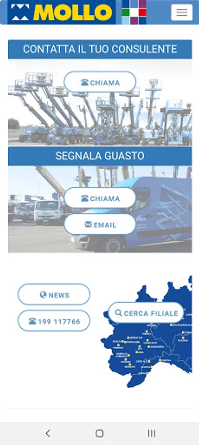 Mollo Noleggio is positioned today in Italy, within its sector, as the player with the largest number of employees (a team of over 300 professionals) and of rental centers (36) distributed in Piedmont, Liguria, Lombardy, Veneto, Emilia Romagna and Tuscany, the largest fleet of machines (over 8,000 units) with an average age of the lowest (4.2 years), the largest service and logistics center (a structure in Alba of 15,000 m2 of which 4,000 m2 covered, dedicated to the workshop, assistance, testing and spare parts sales).