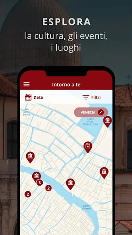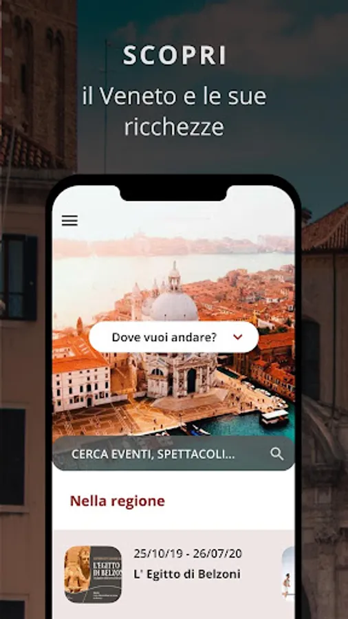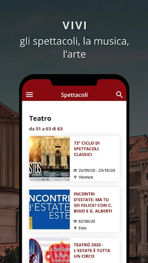 search for scheduled events in places of interest or through geolocation and the "around you" function: shows, theater, music and dance, exhibitions, conferences, events, festivals, historical re-enactments, literary prizes, educational activities
