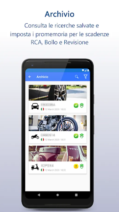 Don't forget your vehicle's important deadlines. With RCA Italy Verification (Pro) you can set reminders for RCA, Stamp and Revision deadlines. Based on the vehicle data, the app provides you with the date on which to set the alerts; you will receive notifications both by email and on your phone before the deadline.