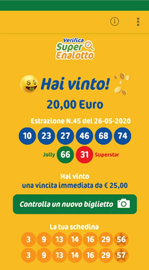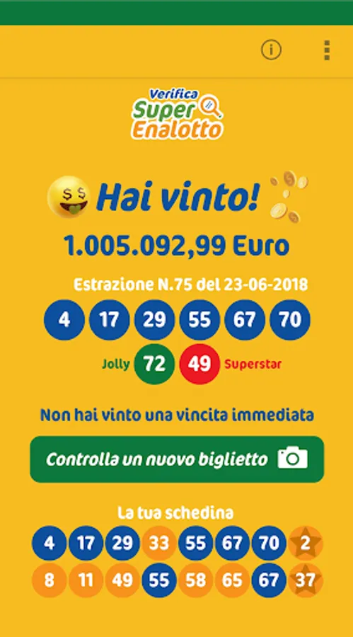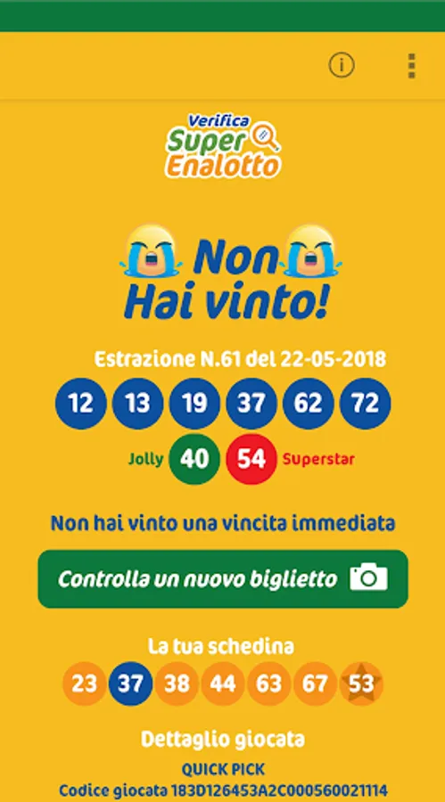 The Verify Super Enalotto app displays your numbers after scanning with the words "Your ticket", the numbers guessed will be marked in a different way.