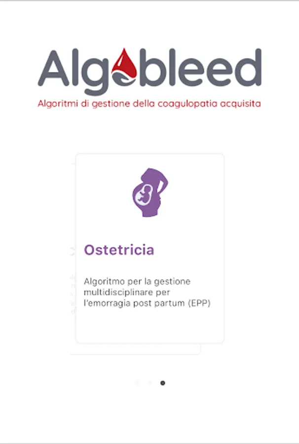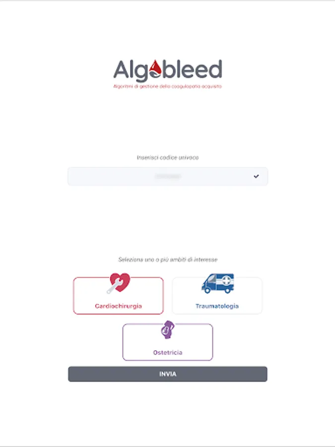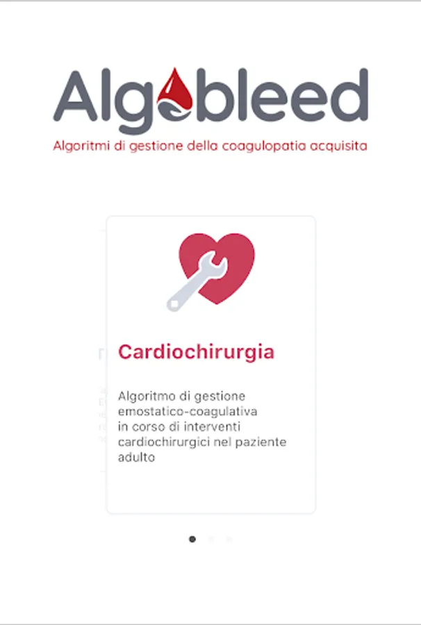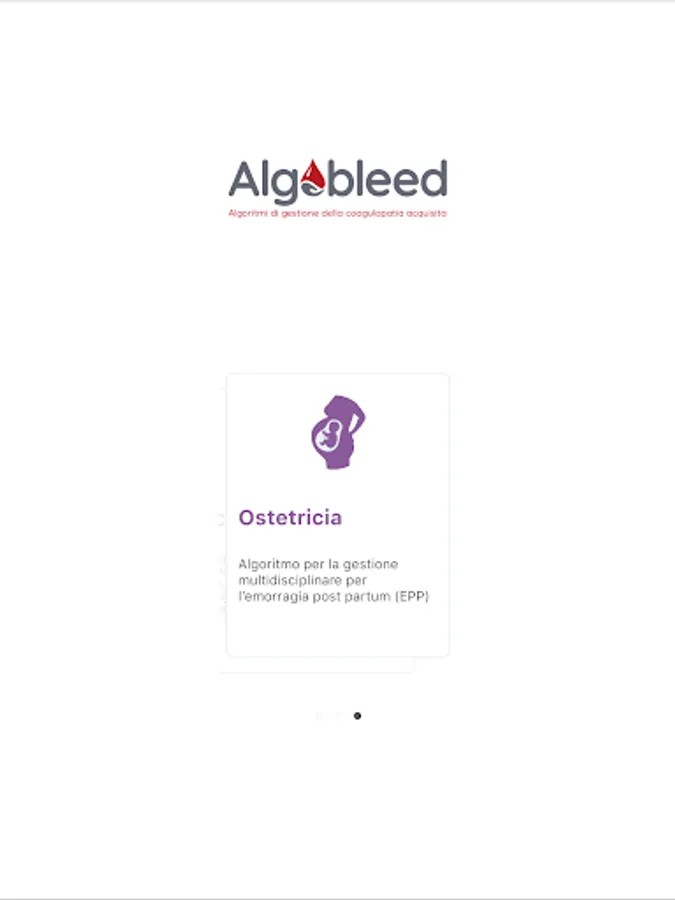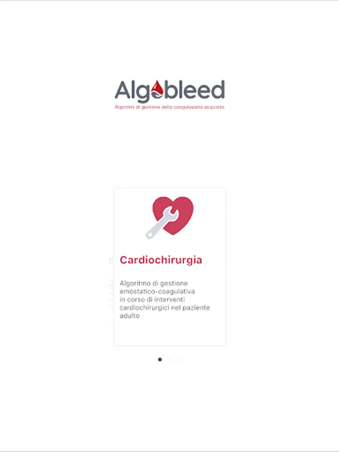 Algobleed allows the consultation of three different algorithms for the management of coaguloapathy acquired in three different clinical settings: cardiac surgery, traumatology and obstetrics-gynecology. The user can select the area of interest.