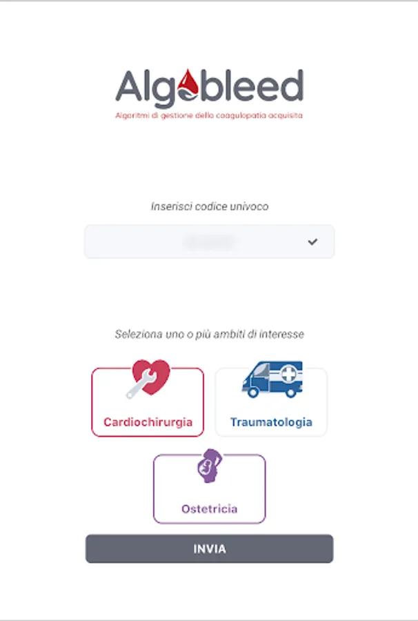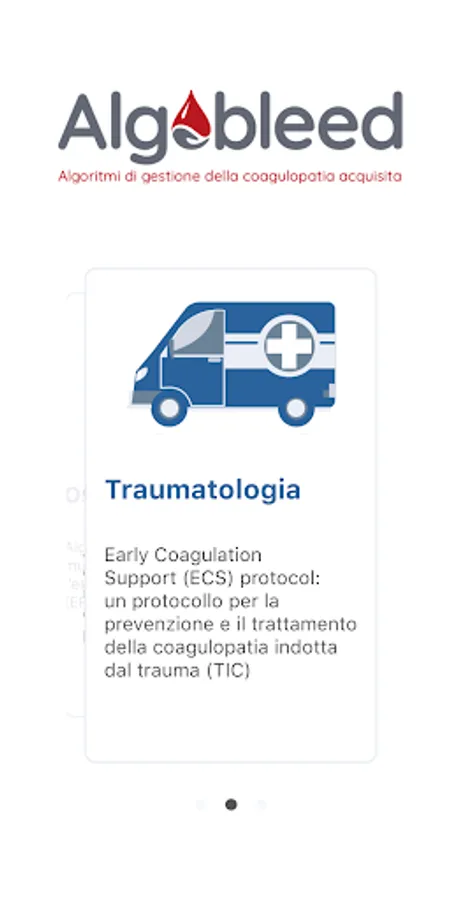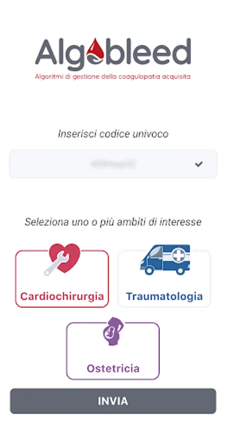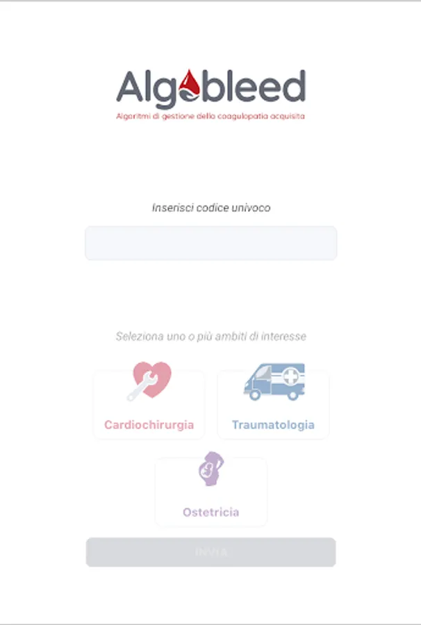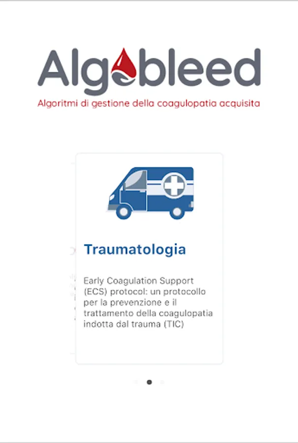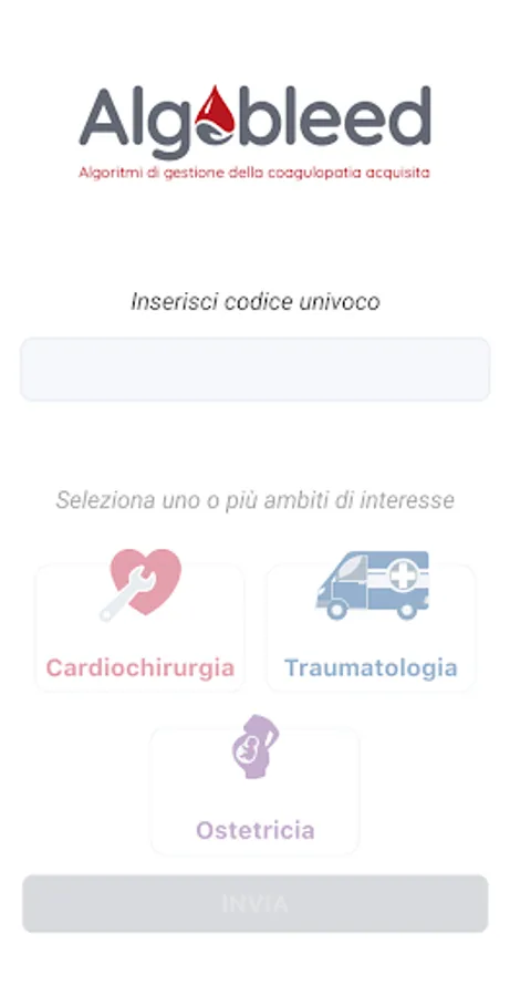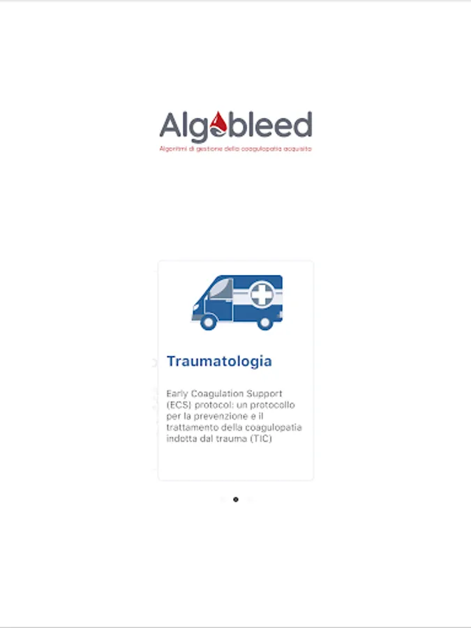 Algobleed allows the consultation of three different algorithms for the management of coaguloapathy acquired in three different clinical settings: cardiac surgery, traumatology and obstetrics-gynecology. The user can select the area of interest.