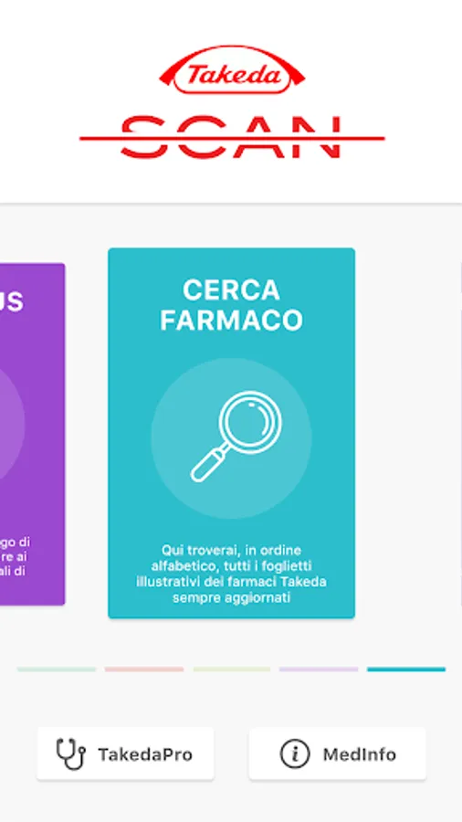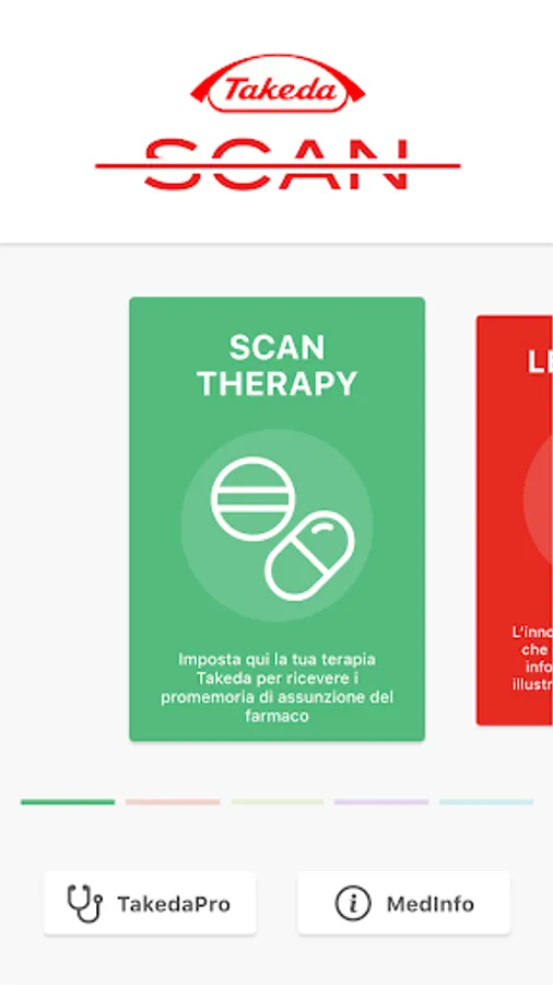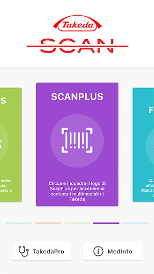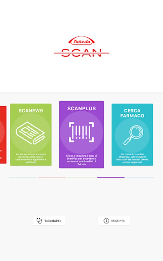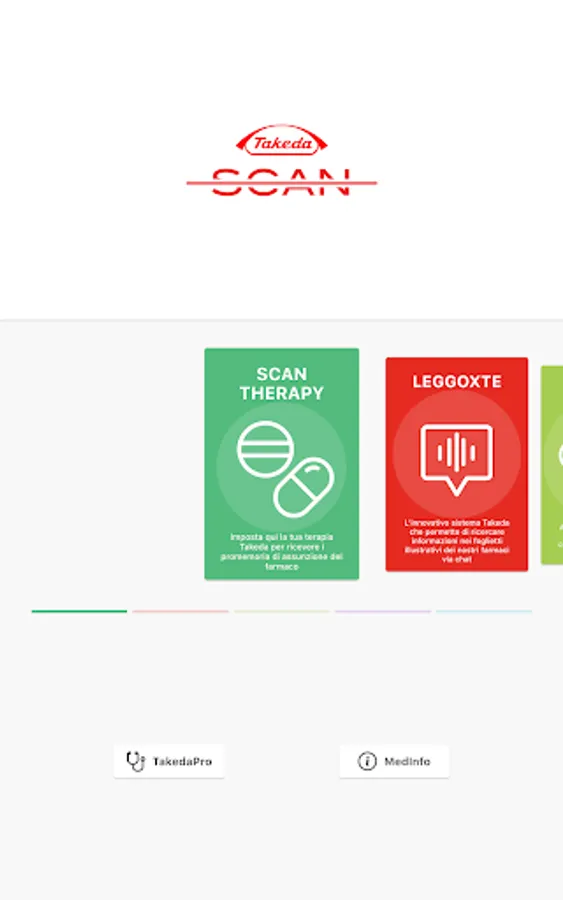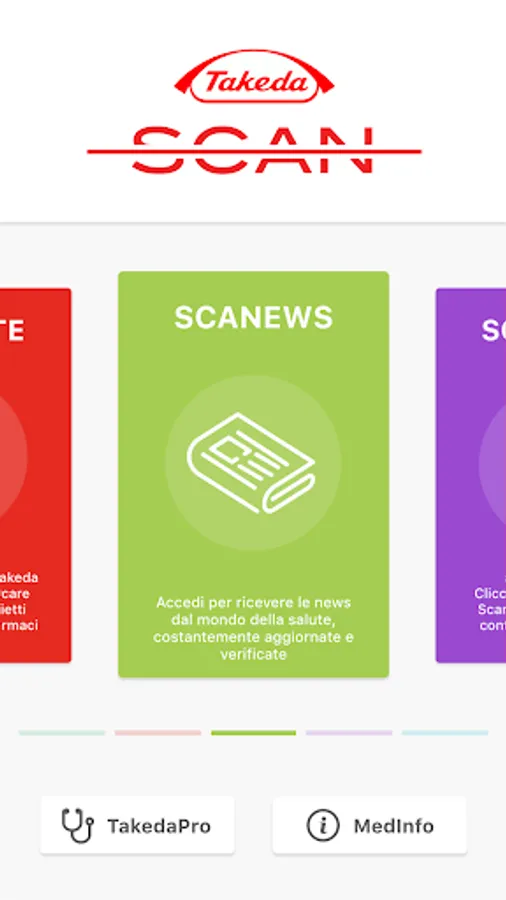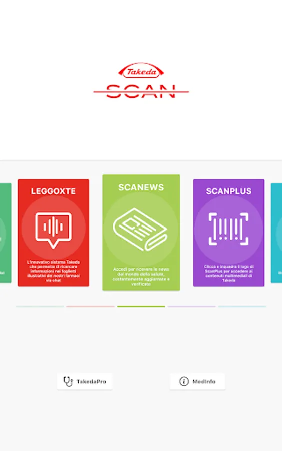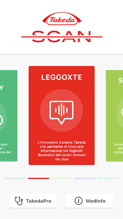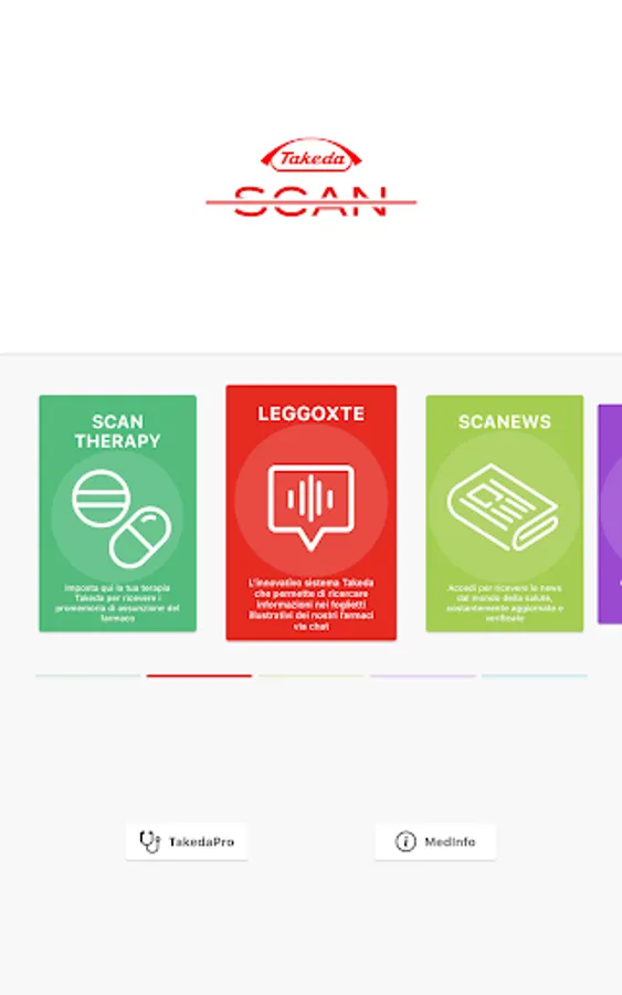 TakedaScan is Takeda Italia's health services app for citizens and healthcare professionals. TakedaScan gives access to the LeggoXTe chatbot which guides users in the consultation and research of information contained in the leaflets of Takeda drugs. The ScaNews function guides the user in navigating the main social networks in search of news related to the world of health in different therapeutic areas. The navigation, filtered by Fake-News, allows you to access only content of high and proven scientific value. With the Scanplus function it is possible to access the augmented reality contents of Takeda Italia.