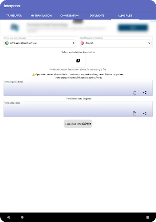 ✓ 🎵 Audio transcription panel many audio formats and translation.