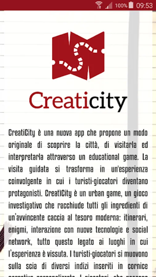 CreatiCity is a new app which offers an original way to discover the city, to visit it and interpret it through an educational game. The tour turns into an immersive experience where tourists-players become protagonists. CreatiCity is an urban game, a detective game that contains all the ingredients of an exciting modern treasure hunt: itineraries, puzzles, interacting with new technologies and social networks, all this linked to the places where the experience is lived. Tourists-players move in the wake of several clues placed into customized frame narrative. Players, who can also be brought together in teams, know the city, clue after clue, will compete in historical knowledge, skill games and puzzles.