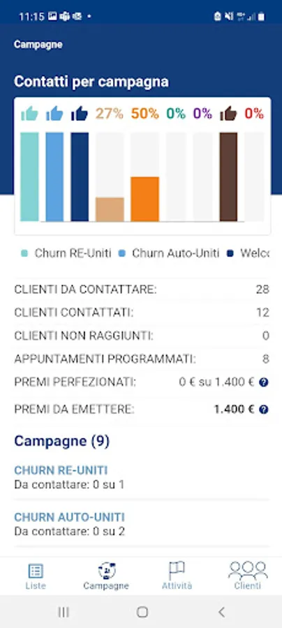 - Have an aggregate view on the management of the marketing campaigns of Cross Selling, Up Selling, Retention (total number of customers contacted, customers to contact, appointments set, premiums collected and potential awards to be collected on customers included in the marketing campaigns);