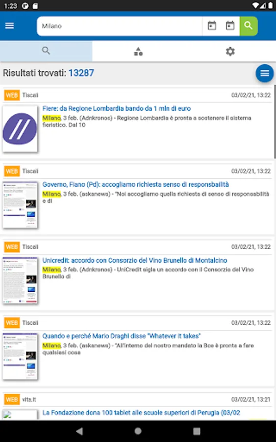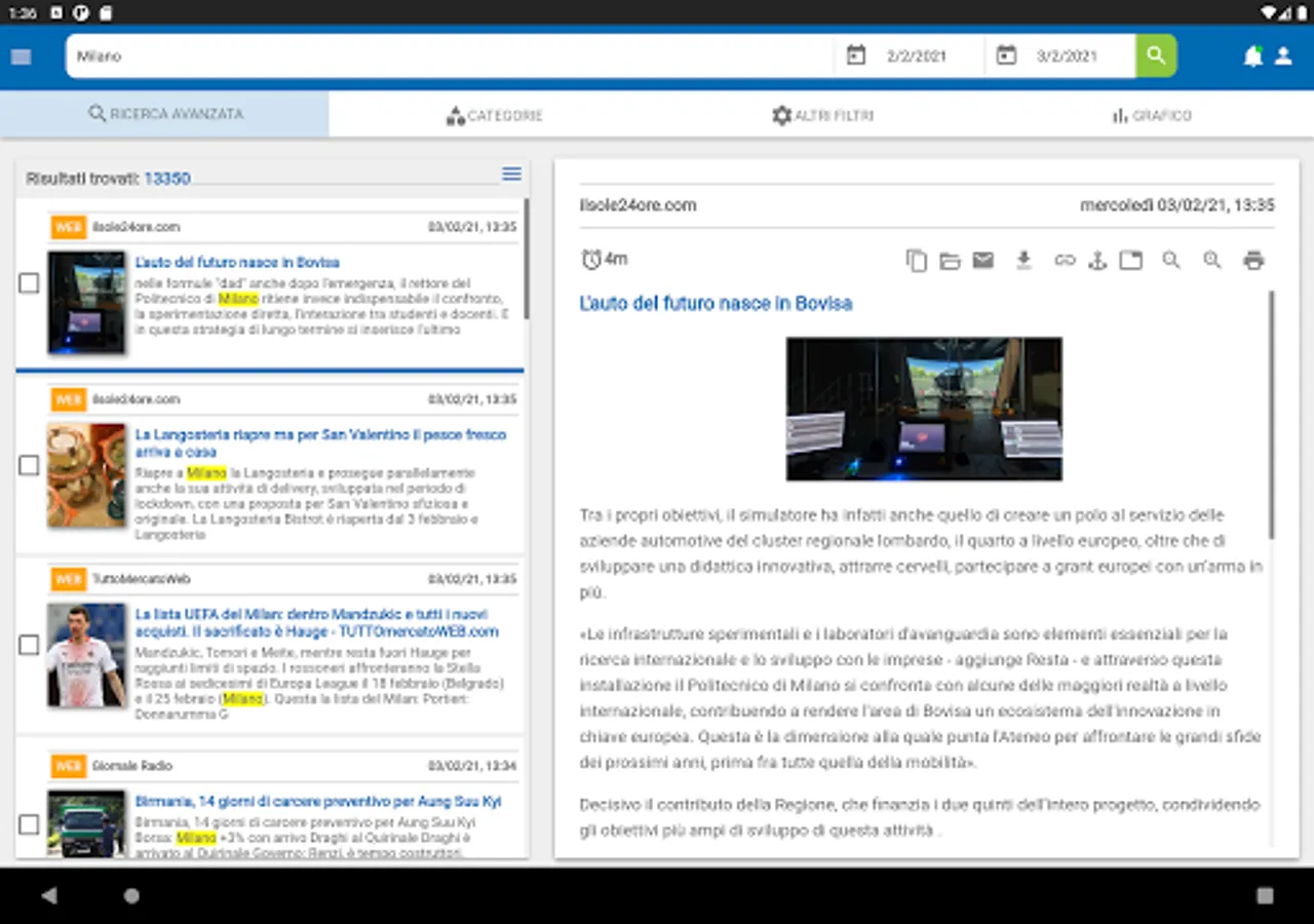 The platform is equipped with a search engine that allows you to find articles, radio and television passages and posts by querying - via key word - a database consisting of press, web, social networks, radio and TV sources and which has over 120,000 new documents every day.