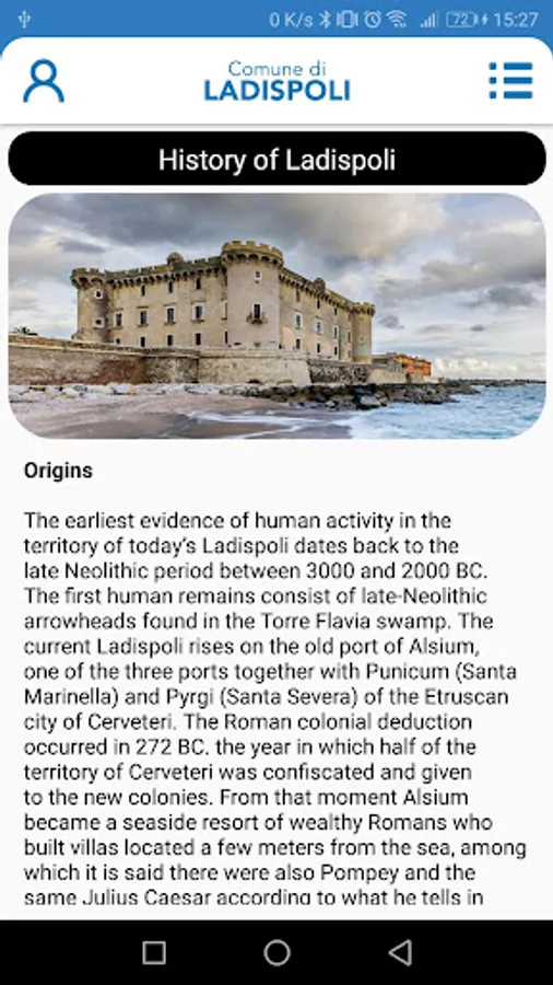 LadispoliApp is the new official App for touristic, cultural, historic, and entertainment information of the Ladispoli Municipality. The app allows users to view in real time on an interactive map, the points of interest and the scheduled events all over the city. By using the App it is also possible to access the main news and the latest updates about Ladispoli.