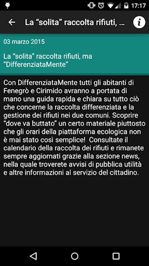 Differentially with you to hand a quick and clear guidance on all matters relating to the recycling and waste management in the two municipalities of Fenegrò and Cirimido. Find out "where it goes threw" some material rather than times of ecological platform has never been easier! Browse Calendar of waste collection and stay up to date with the news section, where you will find notices of public utility and other information at the service of the citizen.