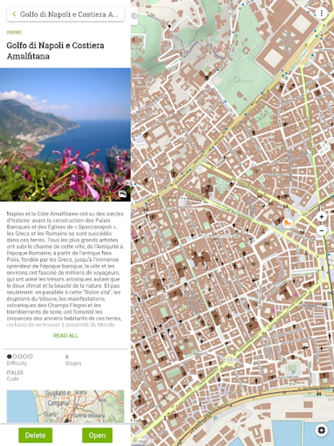 Open Street Map is enriched with selected points of interest, useful to those who travel on foot or by bike, such as fountains, cafés, restaurants and much more. These interest points can be filtered per category and can be searched directly in the main menu.
