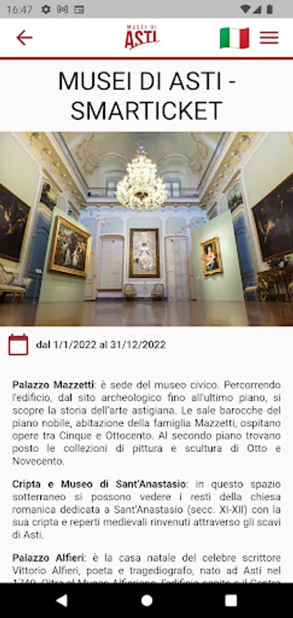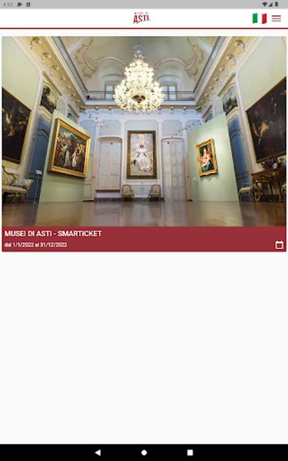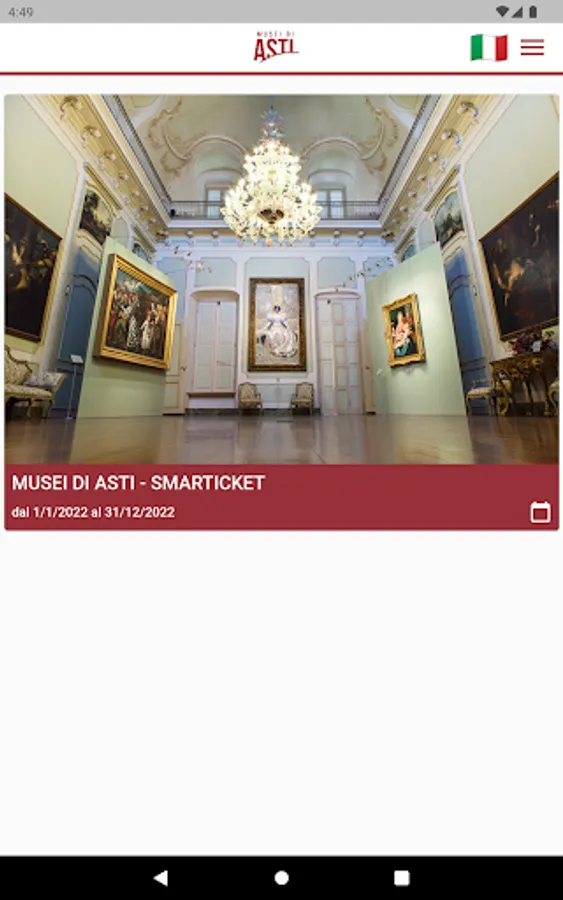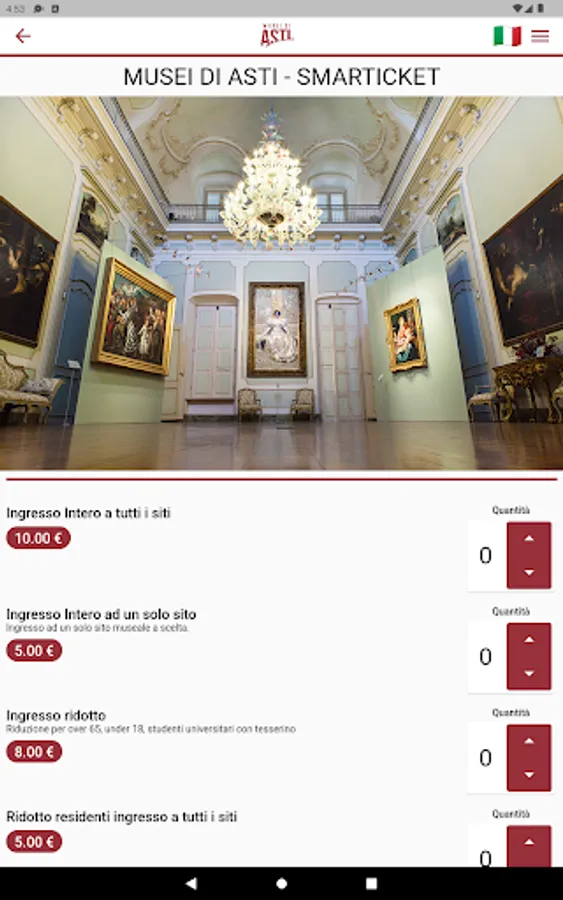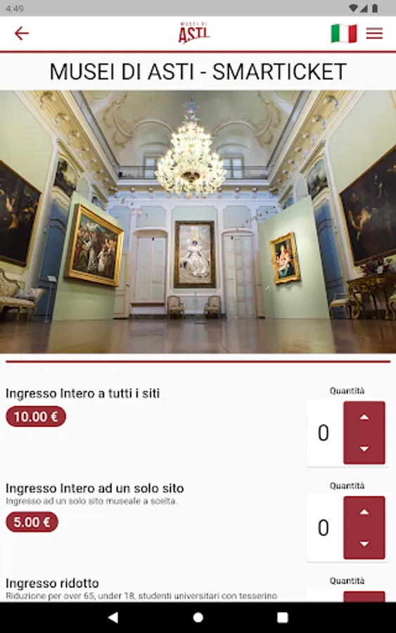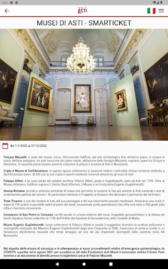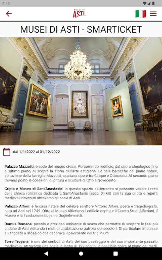 The application is designed to facilitate the entry of visitors to the museums included in the SmarTicket system: Palazzo Mazzetti, Crypt of S. Anastasio, Palazzo Alfieri, Guglielminetti Museum, Domus Romana, Torre Troyana, Complex of San Pietro in Consavia.
