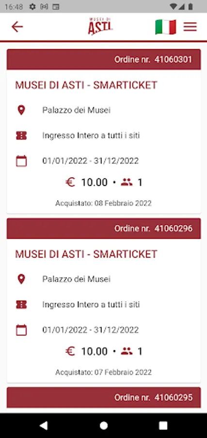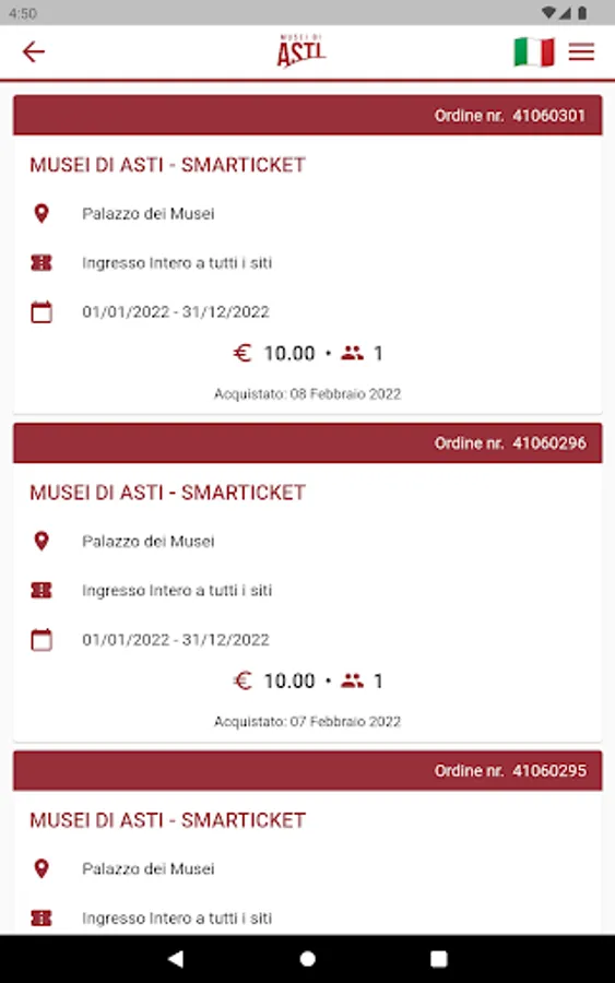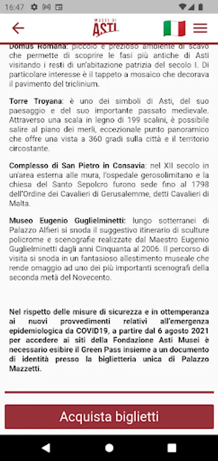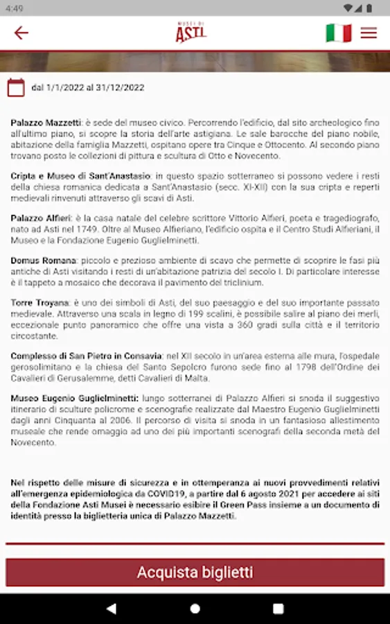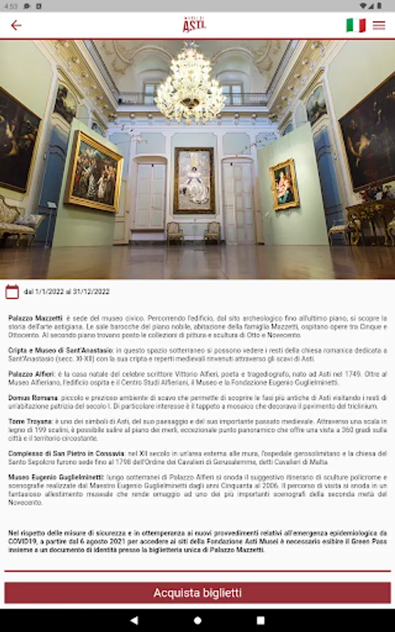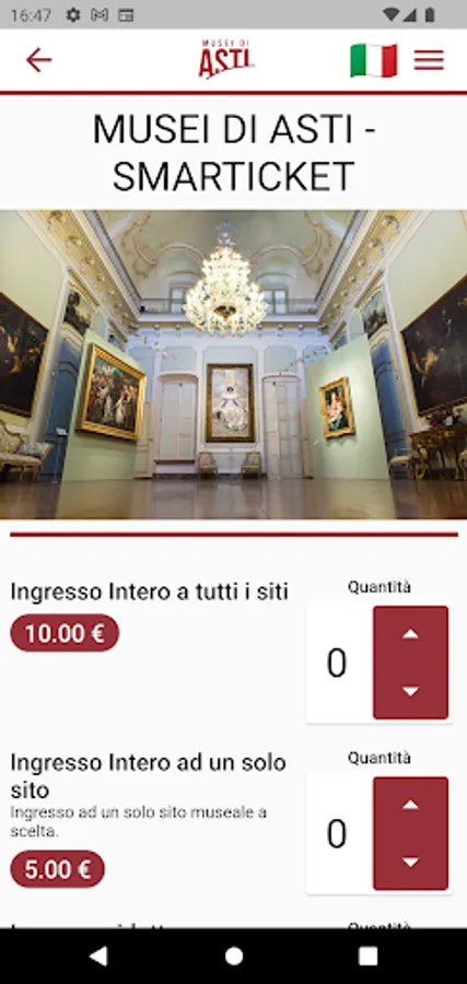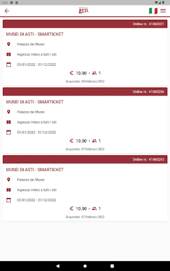 The application is designed to facilitate the entry of visitors to the museums included in the SmarTicket system: Palazzo Mazzetti, Crypt of S. Anastasio, Palazzo Alfieri, Guglielminetti Museum, Domus Romana, Torre Troyana, Complex of San Pietro in Consavia.