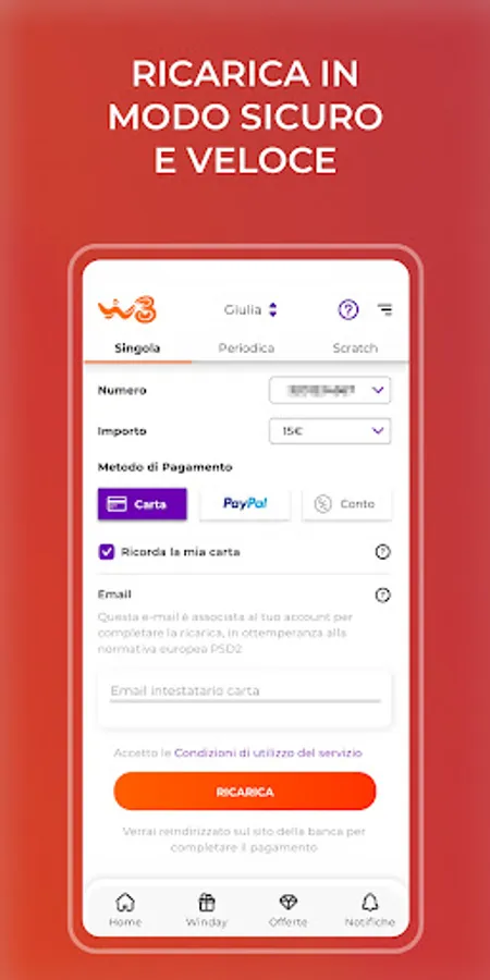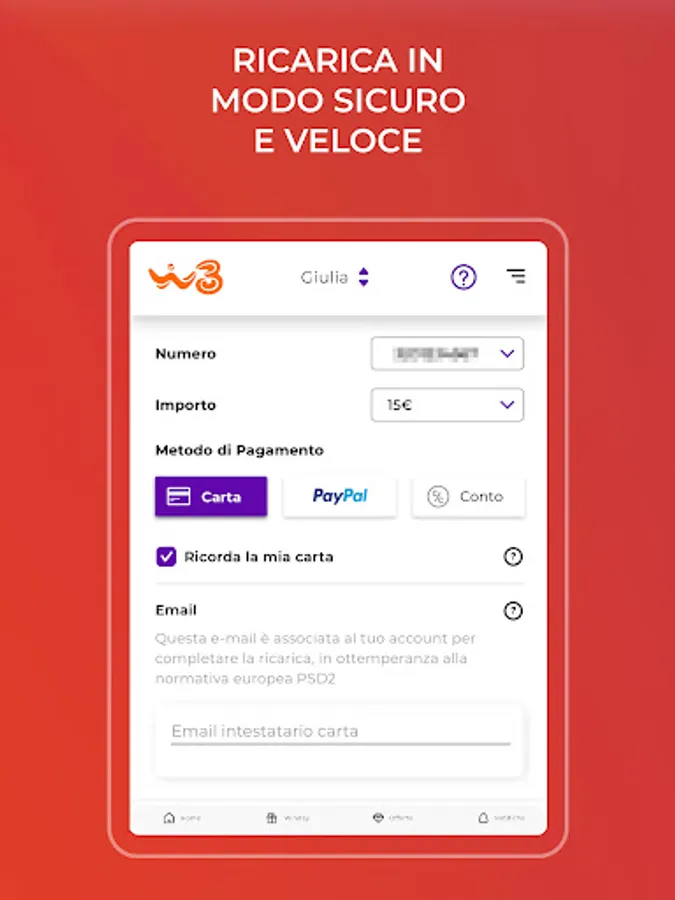 • Top up your number or that of your friends in complete safety, and choose the payment method you prefer: credit card or PayPal. Activate Auto-recharge to avoid running out of credit