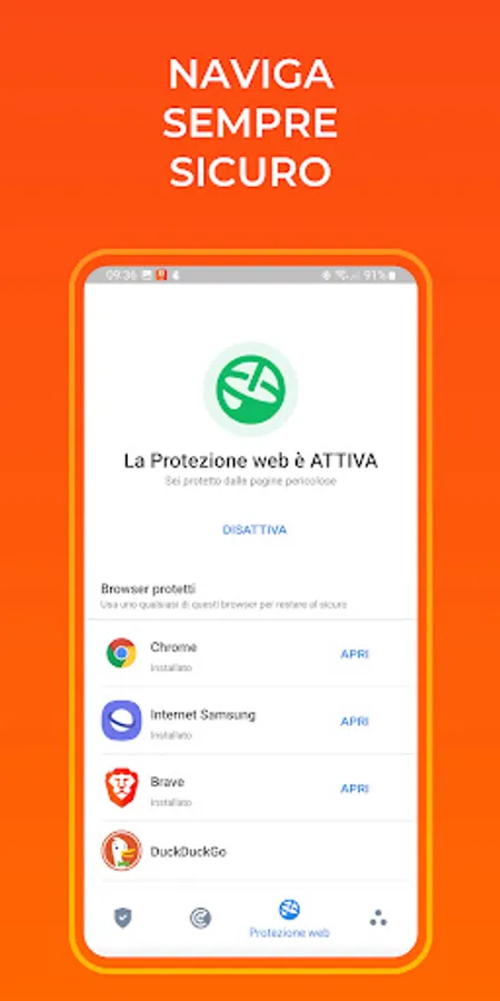 - Web protection - Safe browsing through the most popular browsers, protecting your Android device from dangerous and fraudulent sites, such as phishing sites
