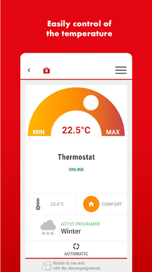Manage the temperature in three different modes: manual, temporary manual or automatic. Turn your smartphone to configure the timer with six different customisable temperature bands: comfort +, comfort, night, economy +, stop/antifreeze.
