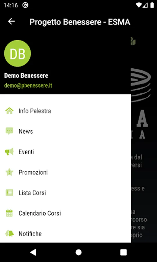 “Progetto Benessere” also allows you to send push notifications to communicate quickly with all members, proposing events, promotions, news or communications of various kinds. It is also possible to view the complete calendar of available courses, the daily wod, the instructors who make up the staff and more.