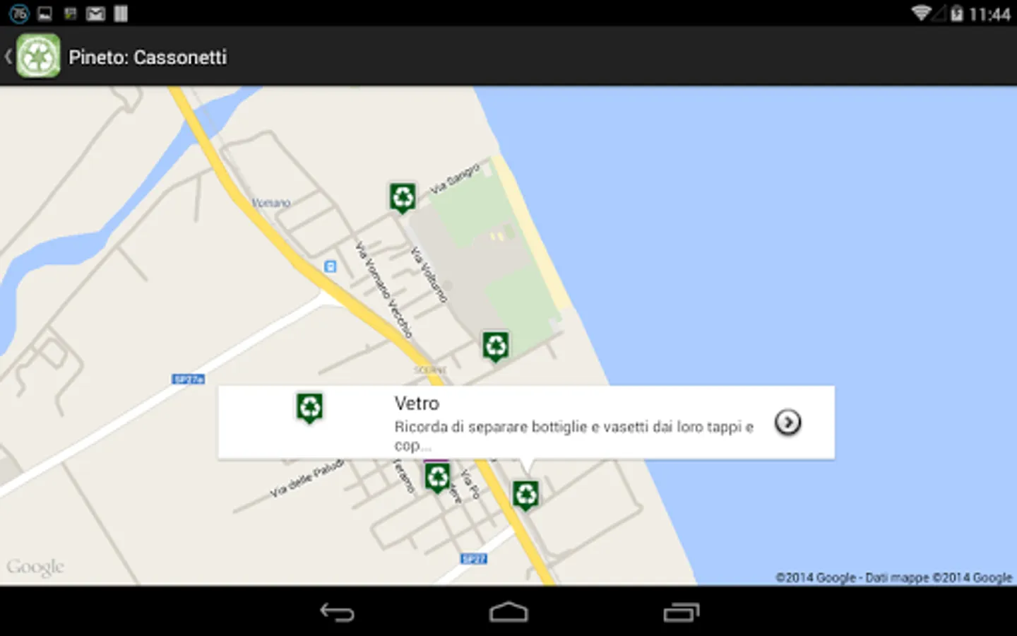 I Recycling Calendar shows the waste of all the municipalities participating in the project and want to make it even more accessible information on the disposal and all citizens. The application also displays a map of all the bins and the centers of collection of your municipality. Tapping on them you can also discover the Calendar of withdrawal of each.