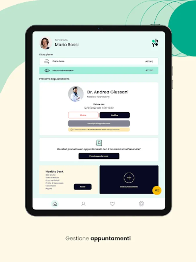 Youhealthy is the new way of understanding health and well-being, as it is "simple to feel good". You have a team of doctors, personal assistants and wellness professionals at your disposal, a series of innovative services to take care of you and keep you healthy for longer. We don't believe that being well just means taking care of yourself when you're sick. For us, feeling good means preventing, maintaining and constantly improving your health. Thanks to our dedicated App, all this is at your fingertips. You have instant access to our services and the entire team of professionals, which you can consult by booking an appointment. You have a Healthy book, where you can upload all your medical documentation and historicize your vital parameters. You can calculate your Healthy Score by answering a few questions about your lifestyle and health.