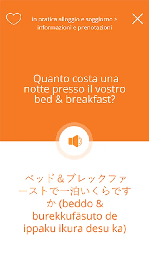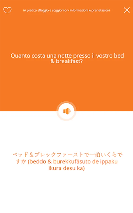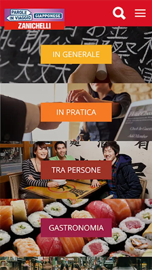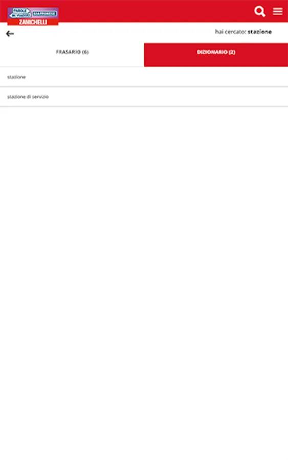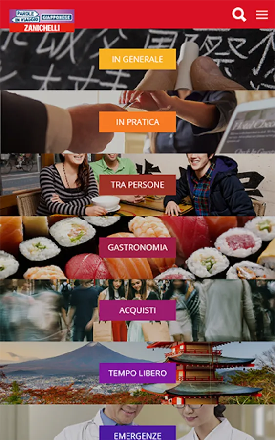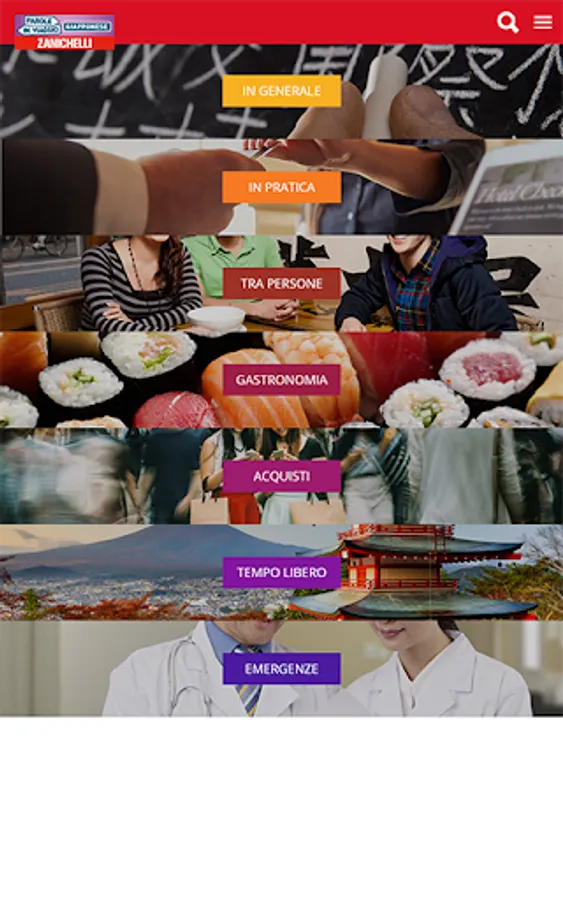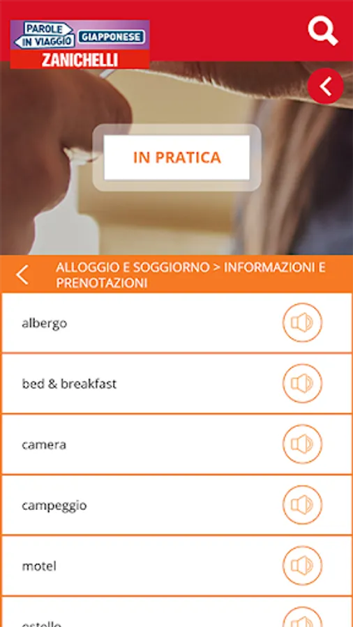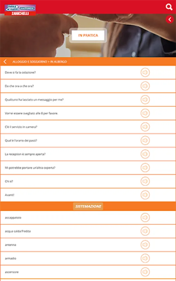 You can search for words and phrases that you need from the Italian or foreign language by using the search engine or from a category (information and reservations at the hotel, departure, arrival, ...)