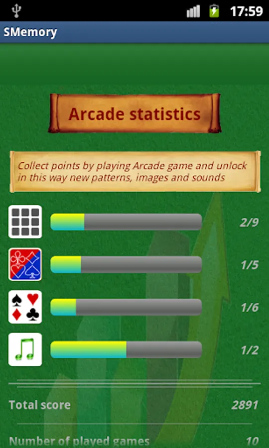 - Arcade game: the player must face with increasingly complex patterns of play and are unlocked by achieving certain results of the prizes which may consist of new patterns, new cards and new sounds.