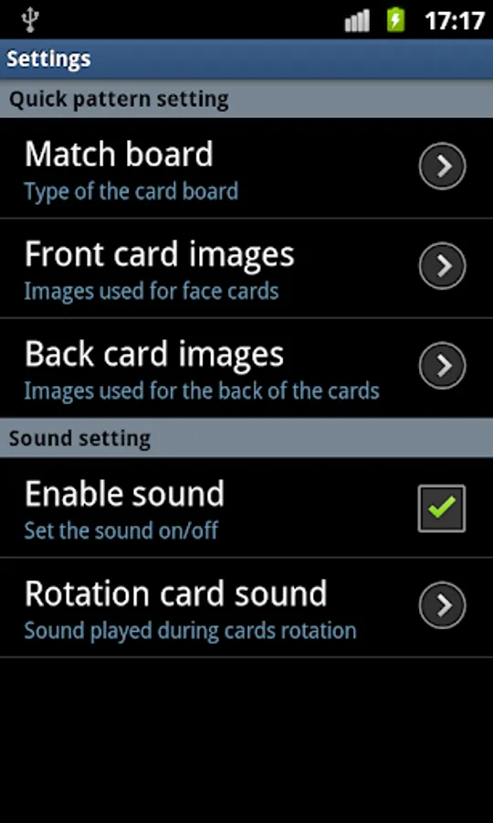 By altering the configuration, in the last two modes it is possible to combine a sound to each card facilitating their remember, but increasing the time of rotation of the cards.