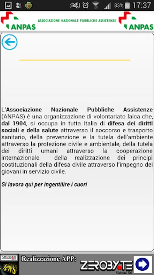 Seeks public assistance Anpas nearest to you. Even on the road you will locate the public assistance Anpas in your way. Join the Public Assistance Anpas throughout Italy to stay in touch with them. Keep up to date on news of Anpas activities: social and health care, civil protection, cooperation, community service. There are many things you can do to soften the hearts starting with this app.