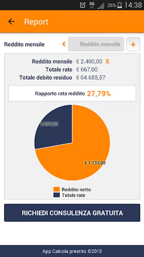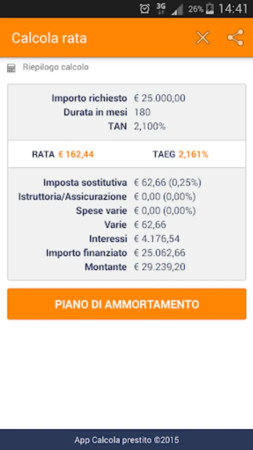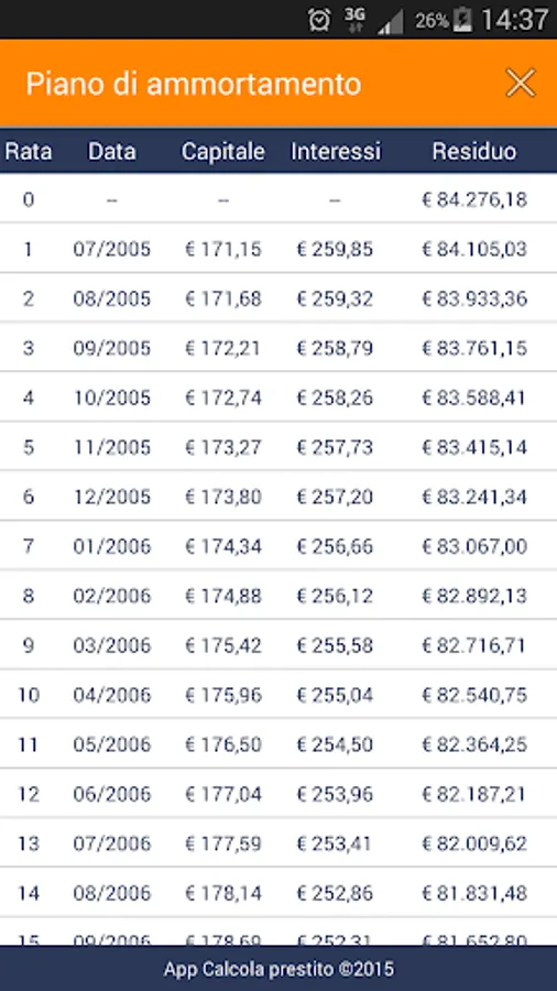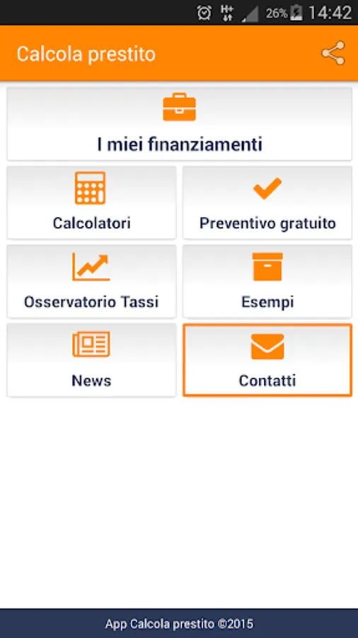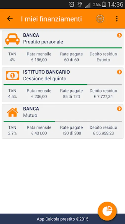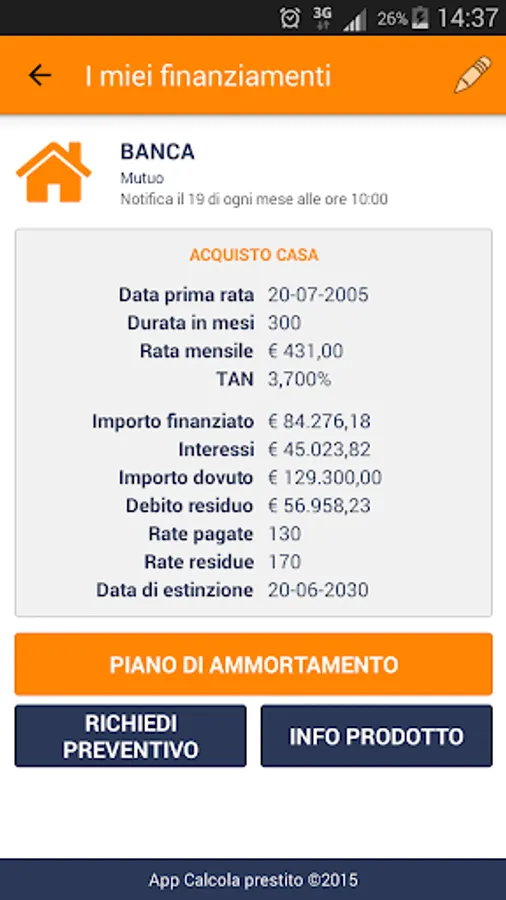App created to allow, in the section "MY LOANS", to enter the references of current loans with a French-style amortization plan and at a fixed rate (mortgage, personal loan, salary assignment and payment delegation) and monitor at any time the residual debt, interest, amount, number of paid and remaining installments, develop the amortization plan and evaluate an early repayment or possible renegotiation. Set the installment reminder, with the day and time of your choice.