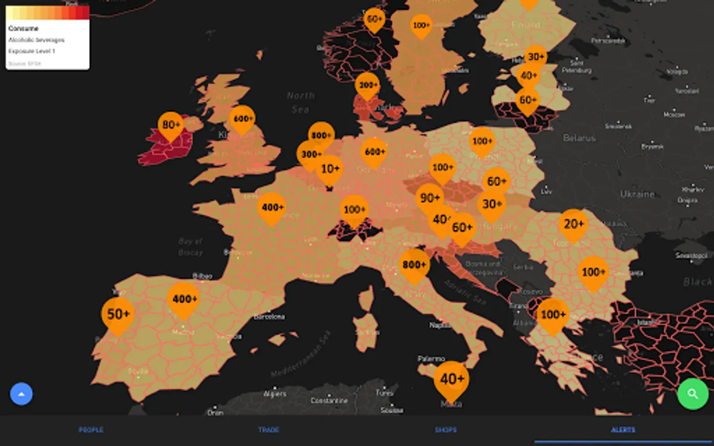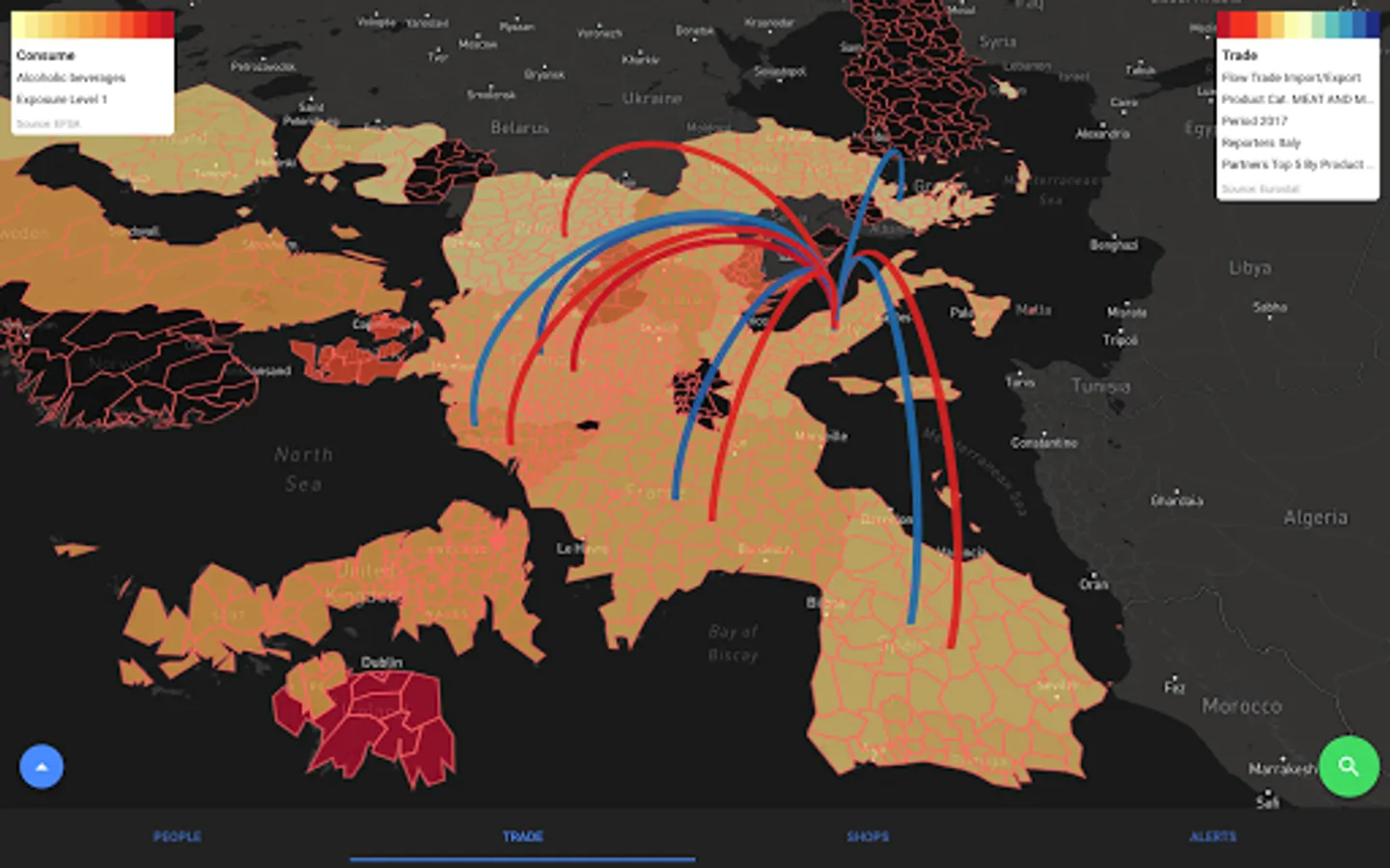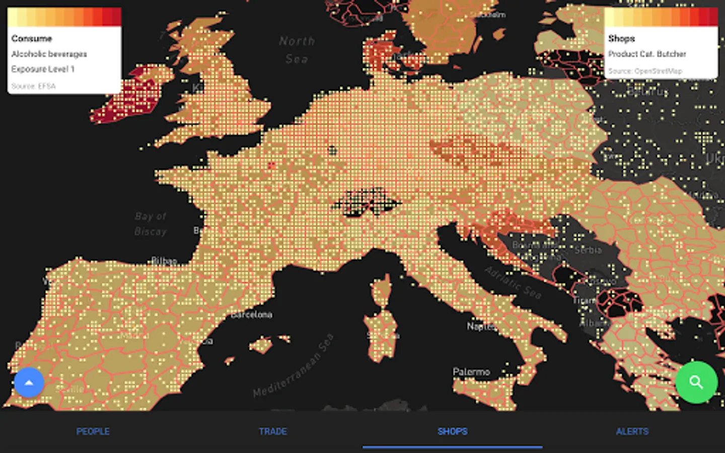 It gathers information from different sources: EFSA, Eurostat, OpenStreetMap and RASFF to render data about: