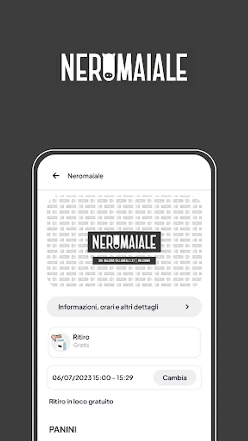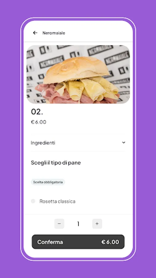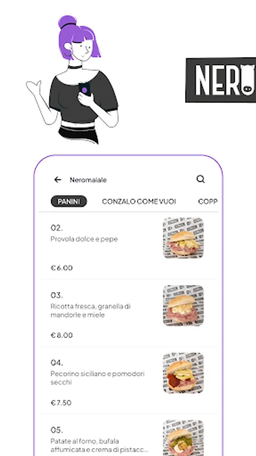 With the Neromaiale app you can consult the menu at any time to discover all the proposed flavor combinations, without forgetting that you can compose your dream sandwich by choosing every single ingredient to add, including fresh and aged cheeses, cooked or raw vegetables, pesto , creams and grains.