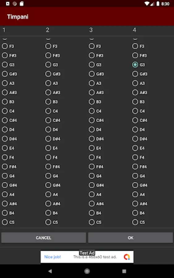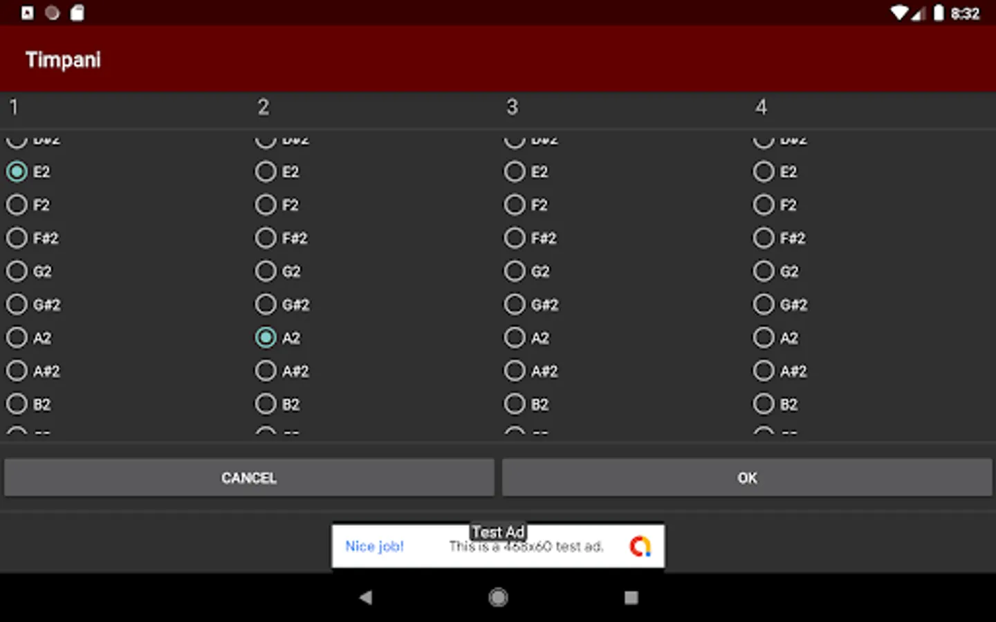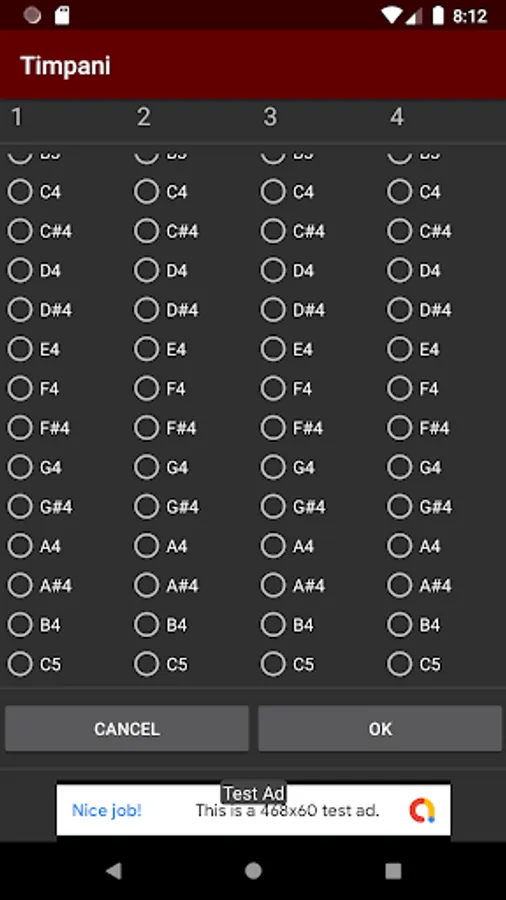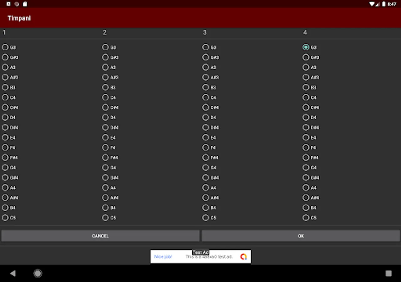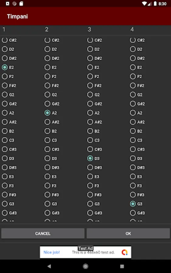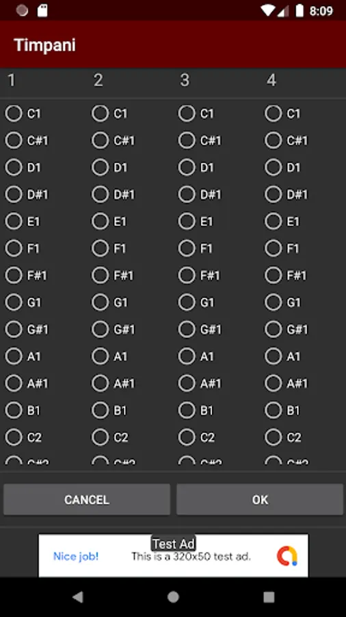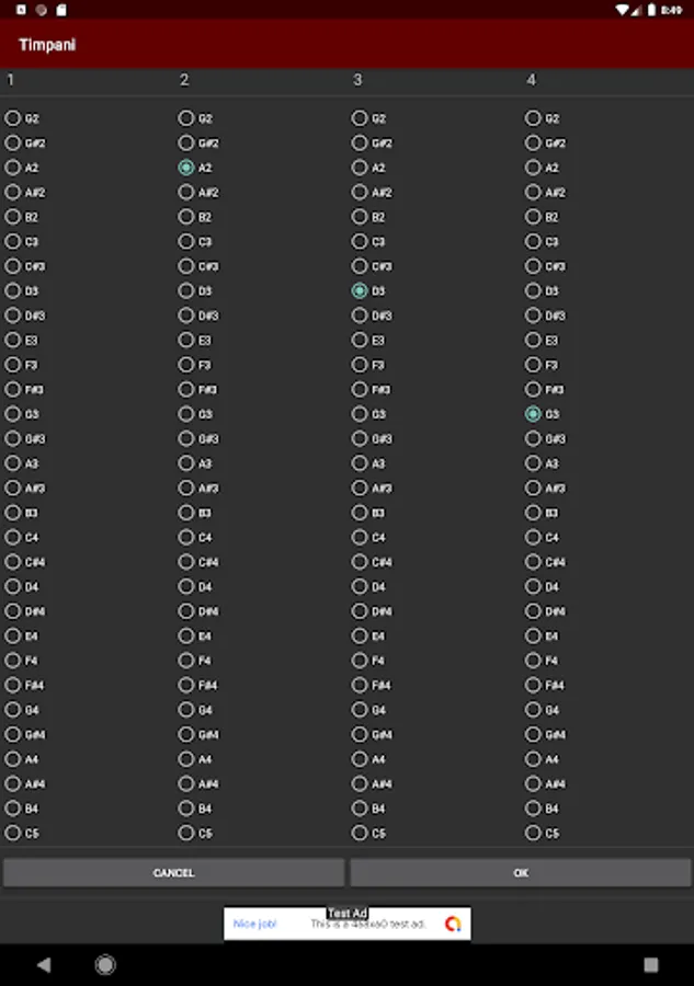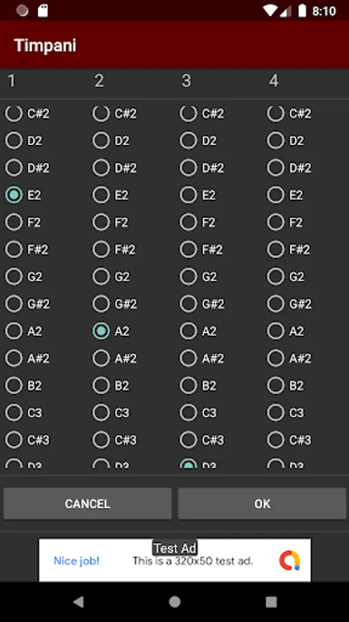 You can assign sounds from C1 to C5 to each of the four timpani on the screen according to your preference.