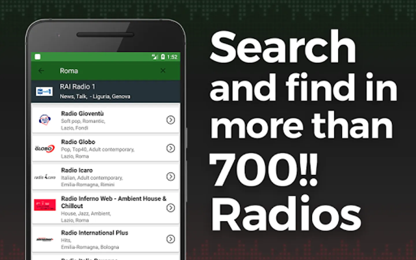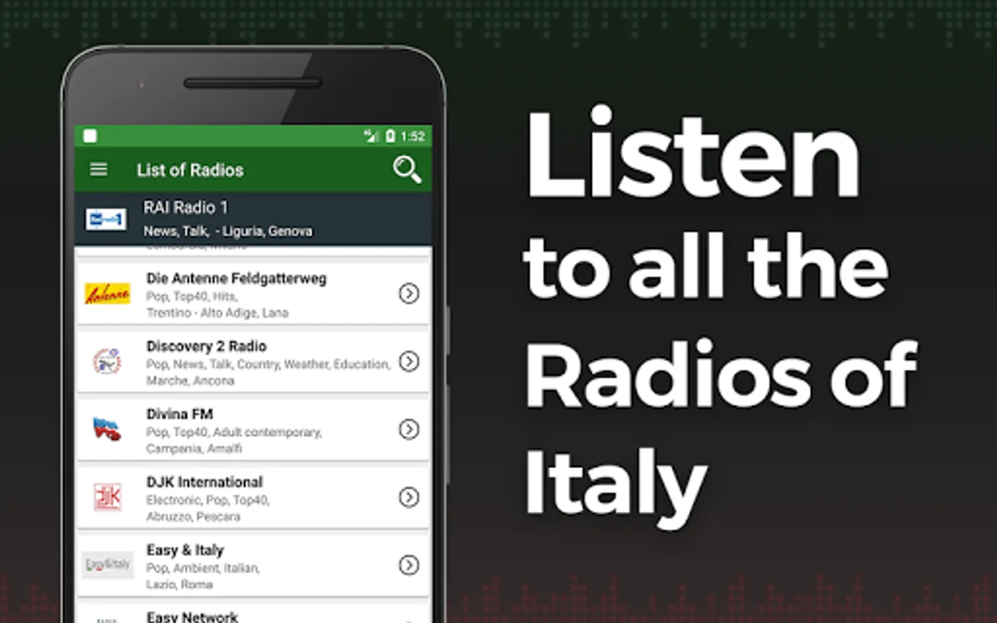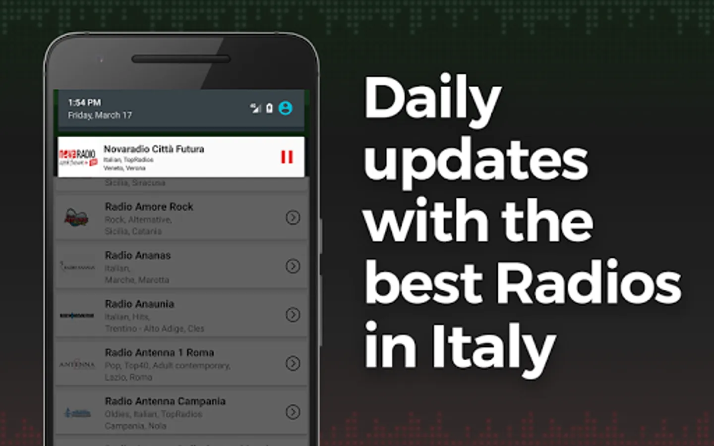 Looking for an app with all the radios in Italy? Don't waste your time!! You've found the Radio App you were looking for, listen online the best radio stations of Italy, easily and for Free, with all types of music, news, sports, ...