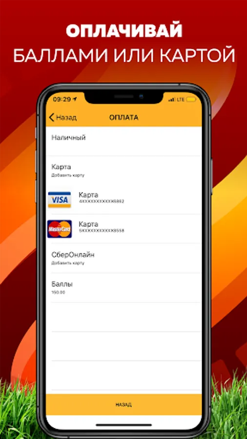 - Payment by card or accumulated points (see the balance in the application)