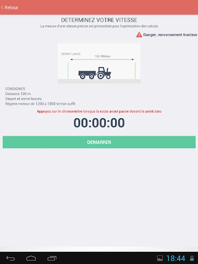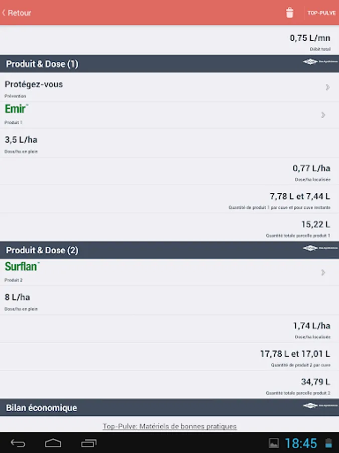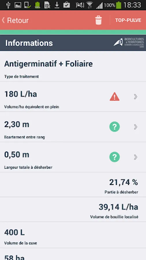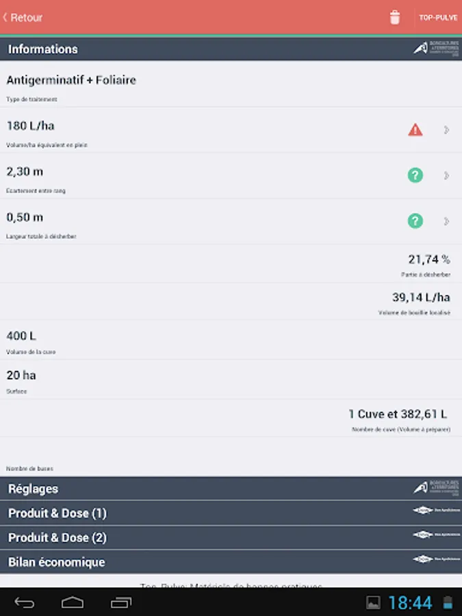 • The application can calculate the driving speed, the nozzle adapted to choose the right pressure, check the flow of each nozzle, calculate the optimal volume of water, calculate the dose to be used for localized weed control with his clean spray. Diagrams and practical advice to guide the user.