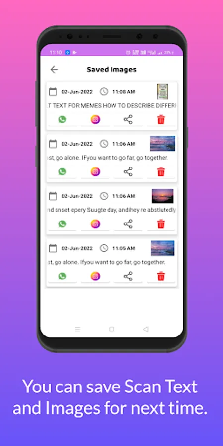 Just choose images from your Gallery or take new pictures with camera and convert them to text then do anything you want such as save, search, edit, etc...