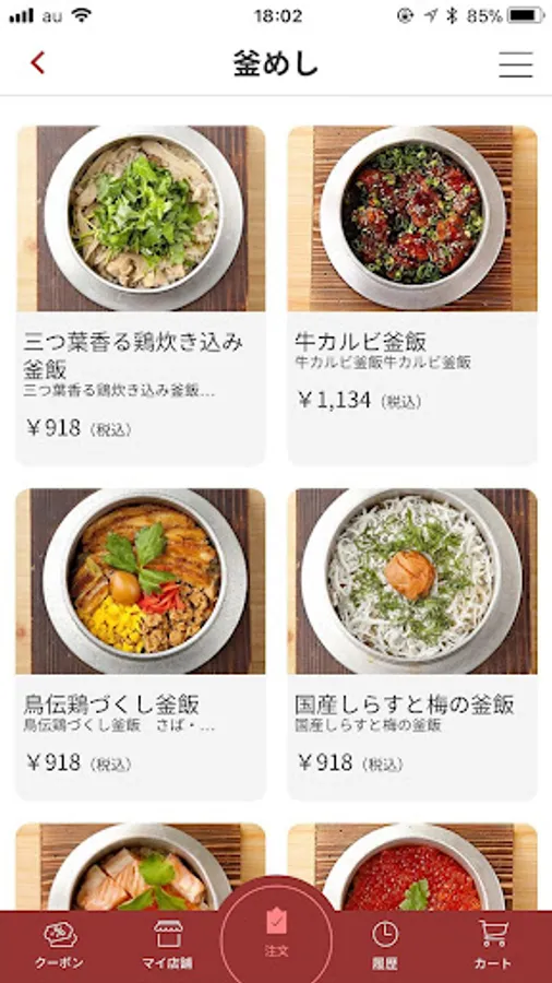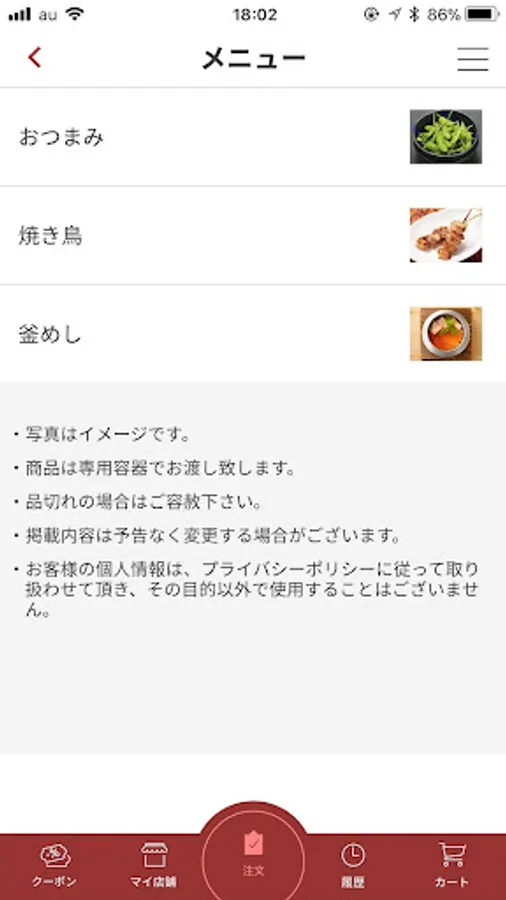 You can make an order reservation for take-out skewers and kamameshi from your smartphone.