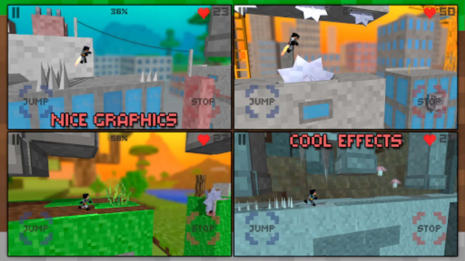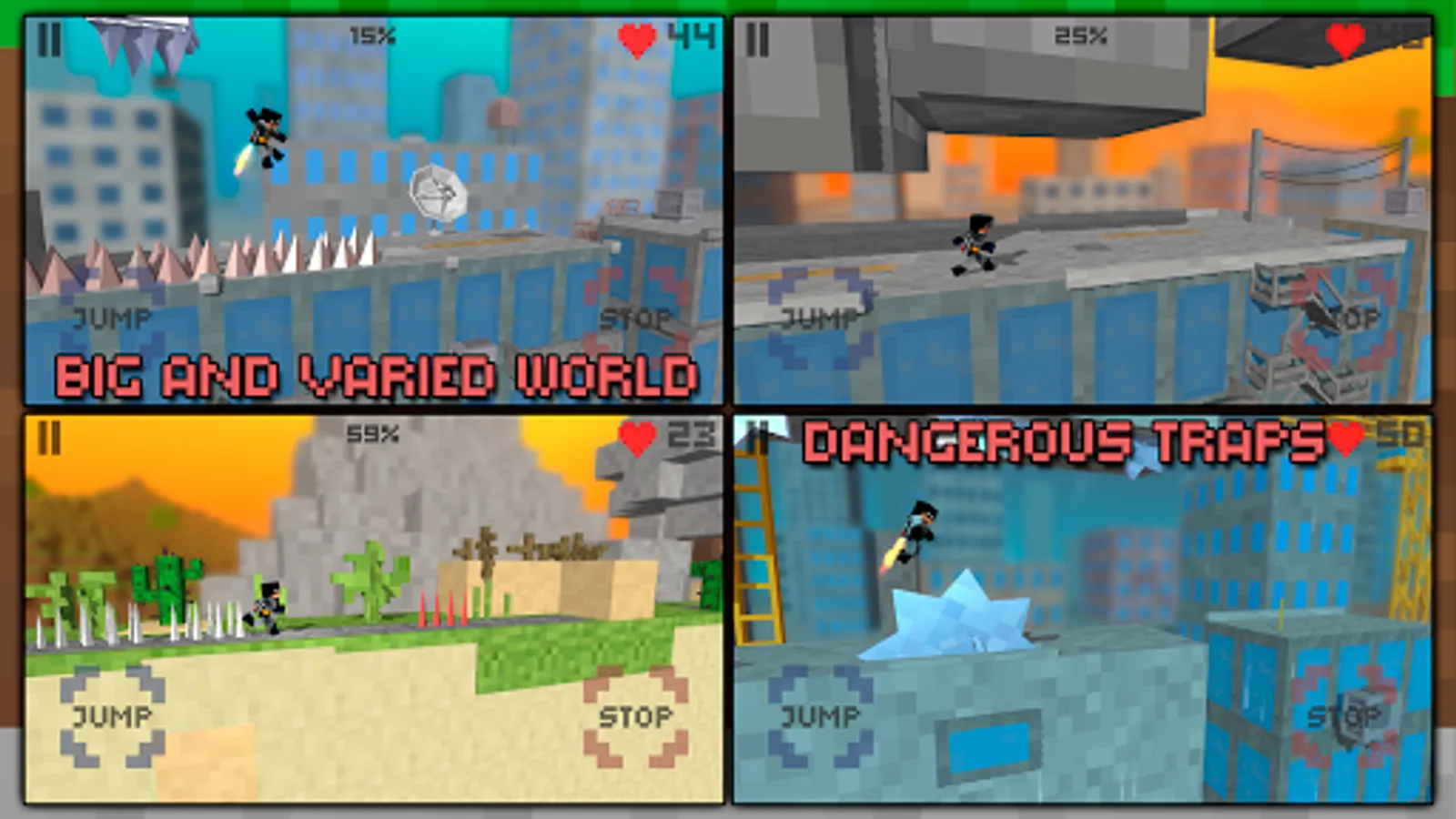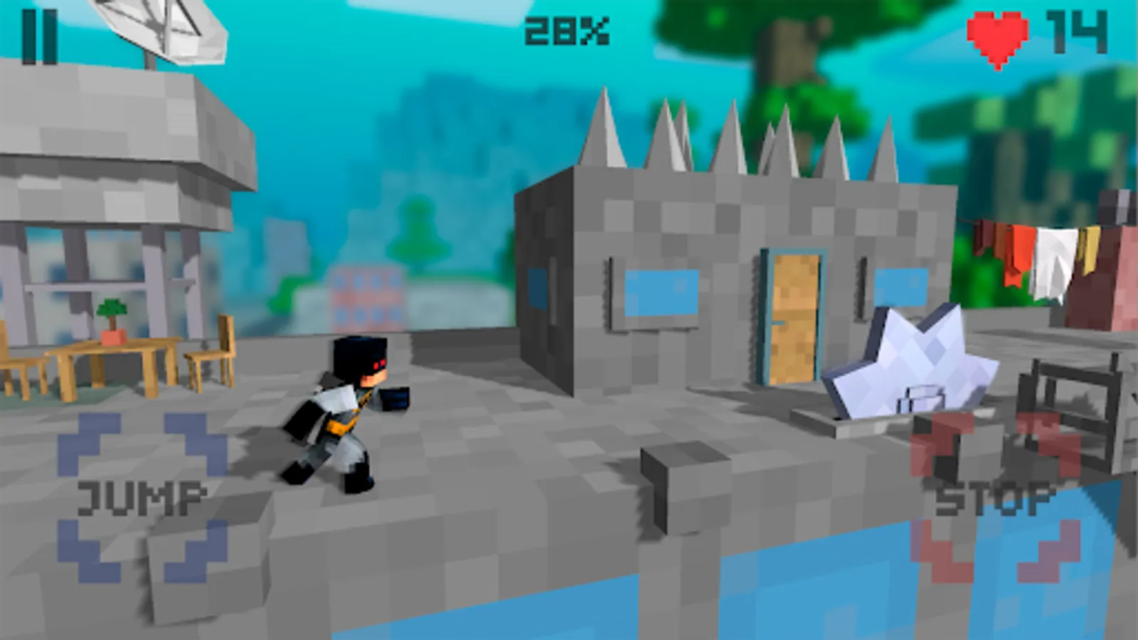 Bat has entered a blocks world full of dangerous surprises. He found himself on the roof of a skyscraper and must reach the finish line to complete a secret mission. He has a little jetpack that will help him fly over cliffs and traps. The target – a dormant volcano. But reaching the finish line is not so easy: a long hardcore road awaits you. Boy running to