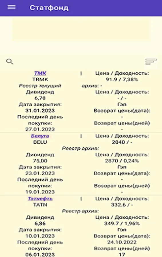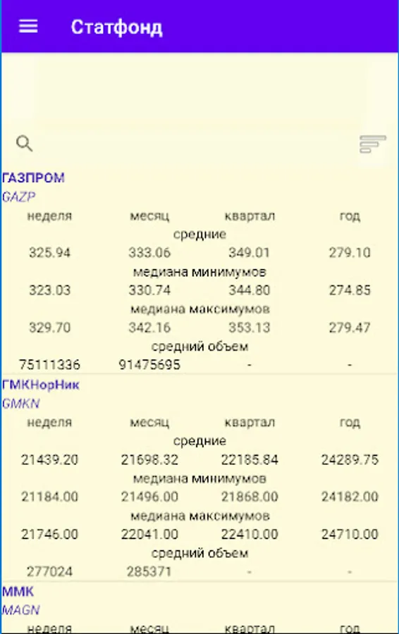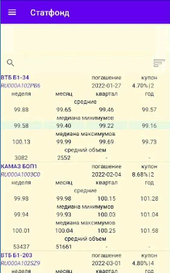 Stock data includes median lows and highs, averages and trading volumes. For bonds, additionally, the size of coupons | the number of payments per year and maturity date, the option of sorting by bond name or maturity date is available. Coupon information is indicated for securities with a constant coupon income.