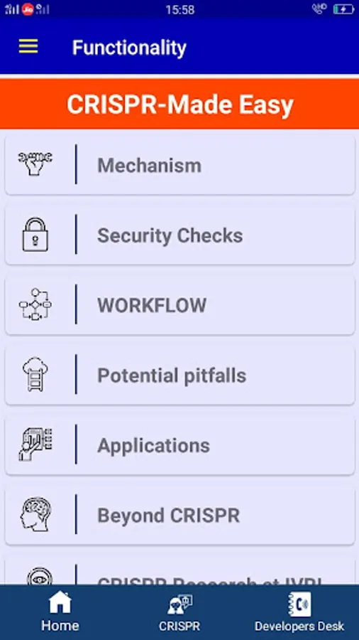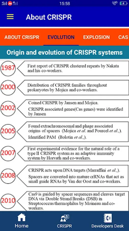 CRISPR/Cas, the revolutionary genome editing technology has evolved to work wonders in the world of science toady. This genome editing tool belongs to RNA guided engineered nucleases (RGENs), which is adapted from natural defence mechanisms of single-cell microorganisms against invading phages or plasmids. It is engineered into various variants and orthologues to make genome editing much simpler, faster, cheaper and more precise than previous existing methods. Using this molecular scissor, researchers can precisely and efficiently insert, remove or change specific sequences in various cultured cells, microorganisms and animals. Among many available CRISPR systems, CRISPR/Cas9 genome editing technology is more widely used and has been developed for broad applicability in biomedical research, study of developmental biology, drug development, diagnostics, animal models, producing disease free animals, cancer cure, gene therapy and therapeutics. This app aims to provide wide scale information on CRISPR, its evolutionary history, its different class and functionality