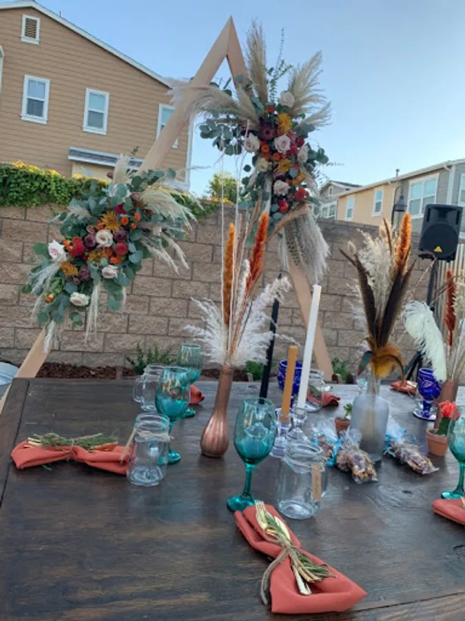 "I love the idea of a styled stage set - made of dried leaves, and flowers in a circumferential frame.Circle the structure and create a lush garden feel. It would look beautiful on a table or in the middle of your wedding party, or even in your living room.