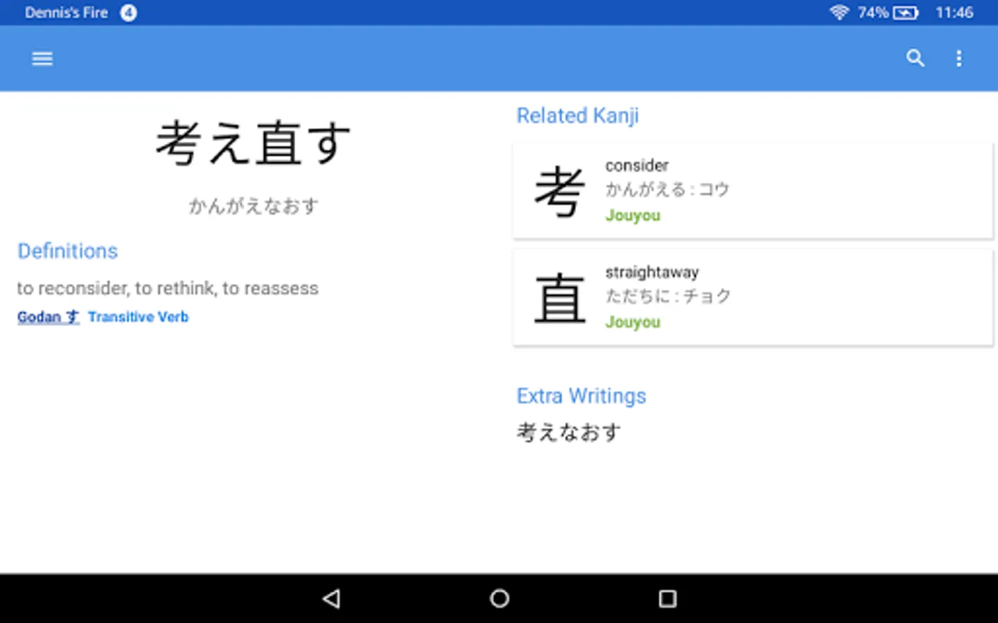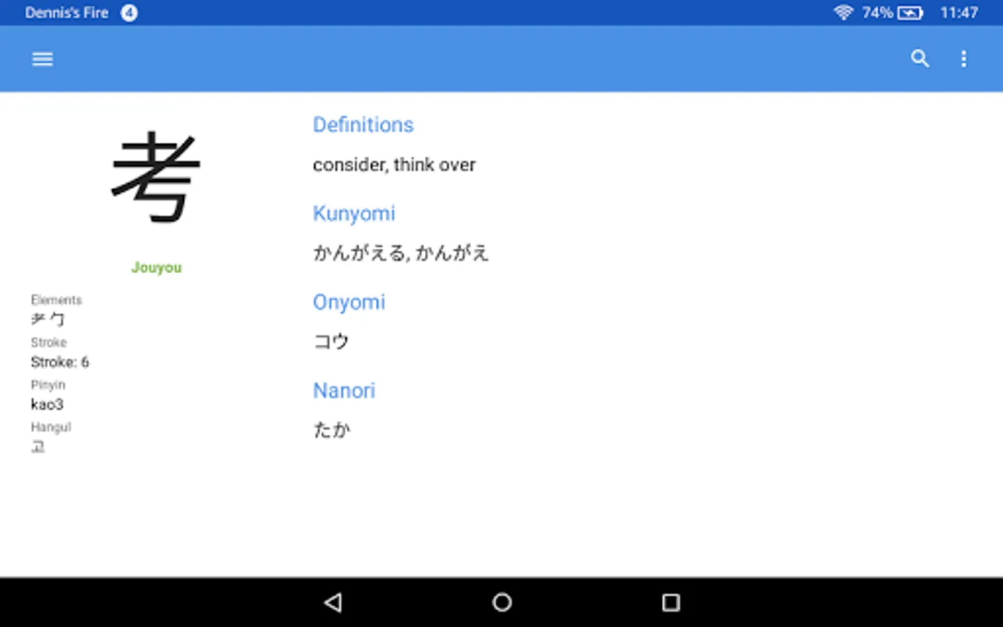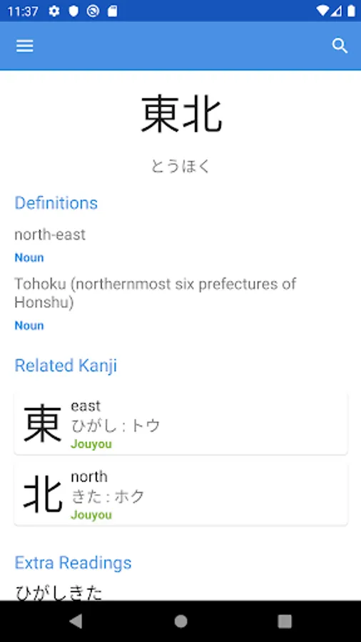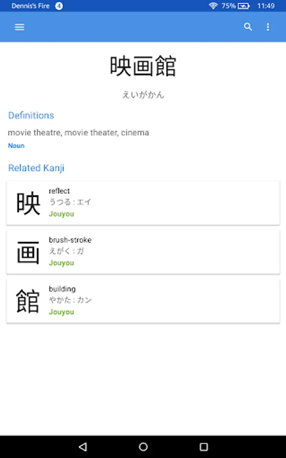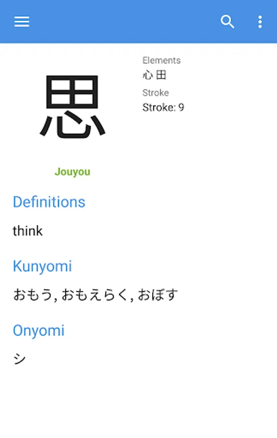 Kanji within a query will automatically be singled out and all searched for at once in the kanji dictionary. Stroke order diagrams are available for over 6000 kanji. View them by tapping the kanji itself in the entry viewer.