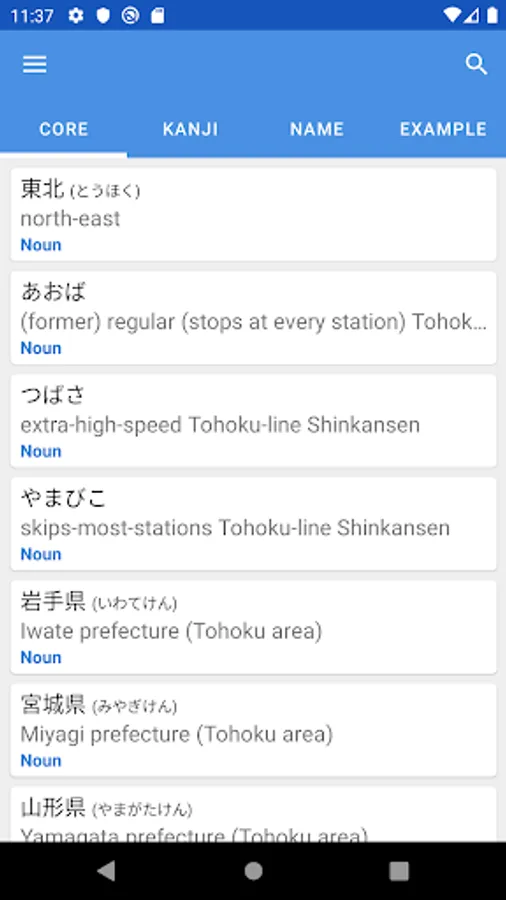 Regular, Kanji, Example, and Name dictionaries.