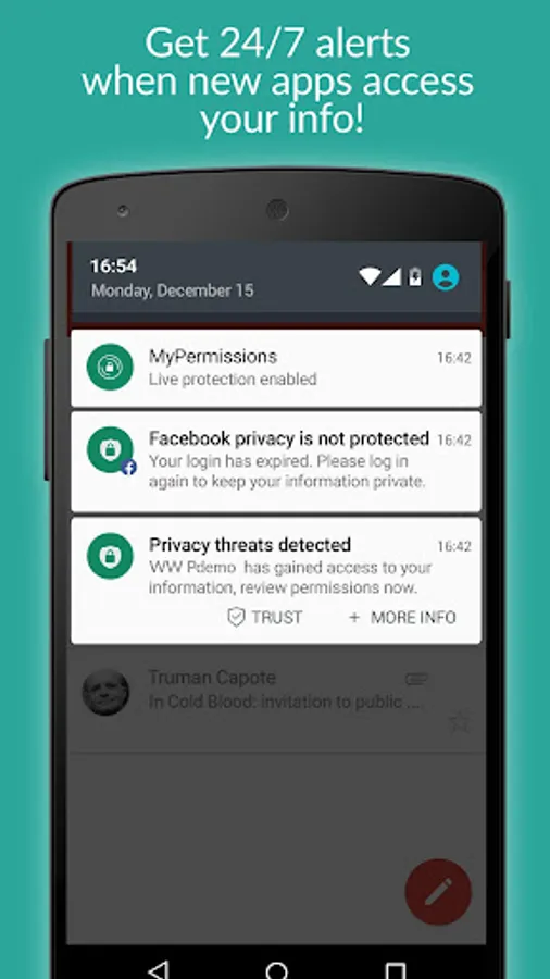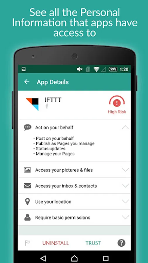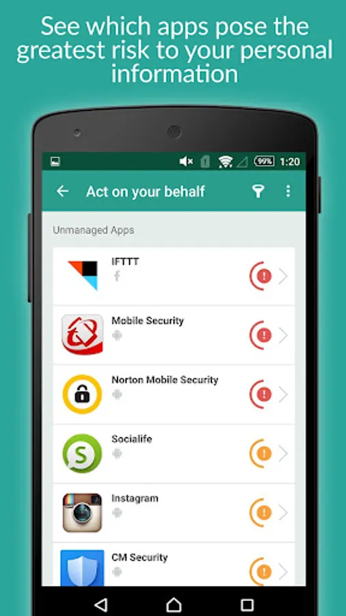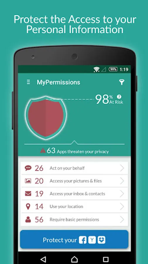 With MyPermissions, you can manage your personal information smartly! Avoid sharing photos, documents, location information, contacts, emails, and other sensitive information without your knowledge.