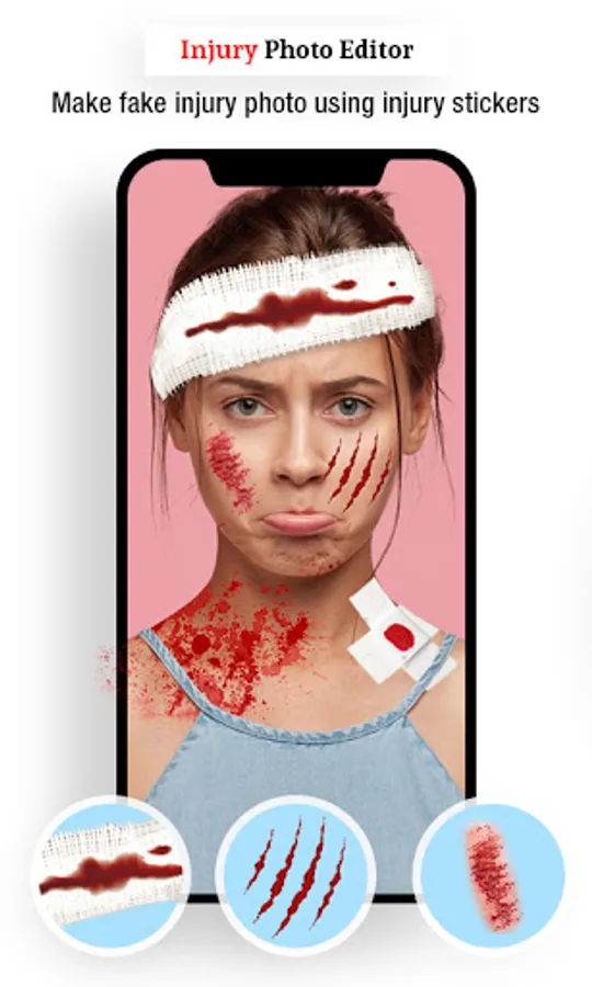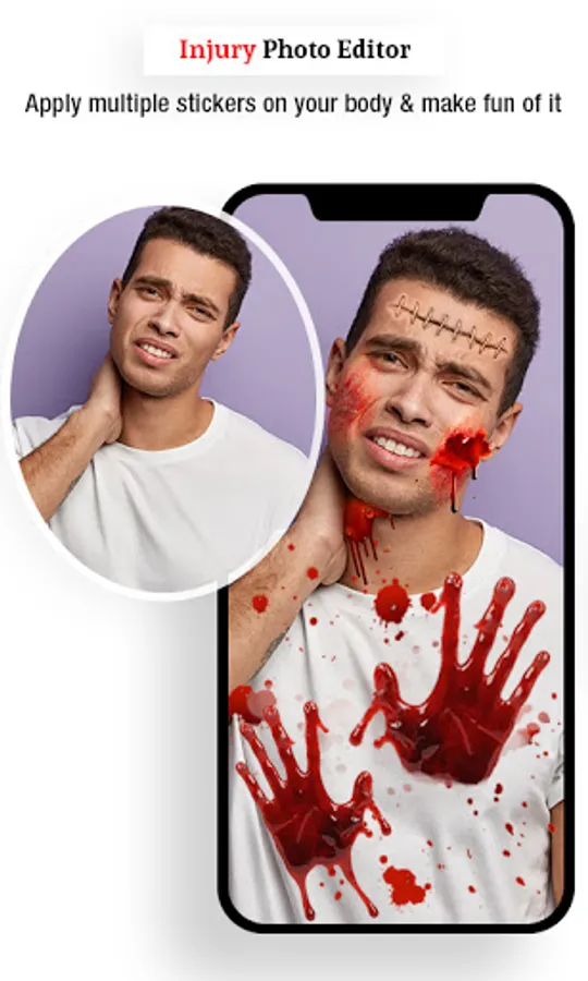 Create injuries on yourself or on your friends/family photo using this Injuries Photo editor. We created multi category injuries that are specially design to create realistic effect. 100+ injures available that fit just right on your body.