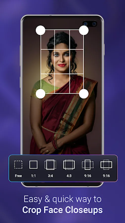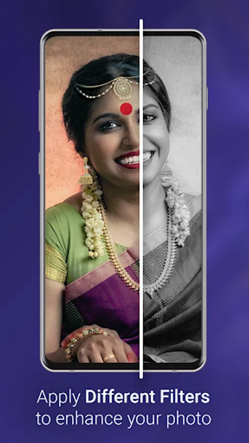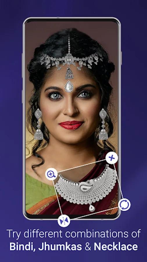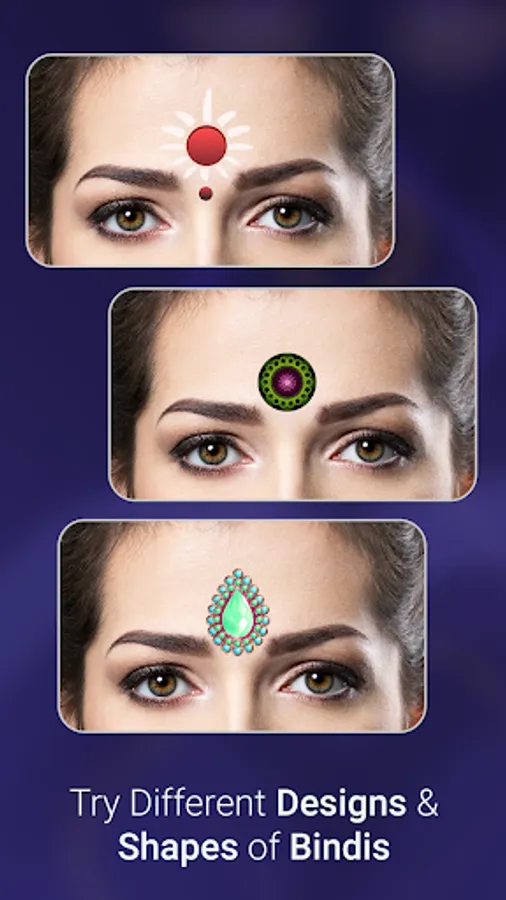 The app provides many modern and traditional Bindi designs, shapes and colors. You can choose any one or more and place it on your photo. Either place it on photo directly or click a photo using mobile camera.
