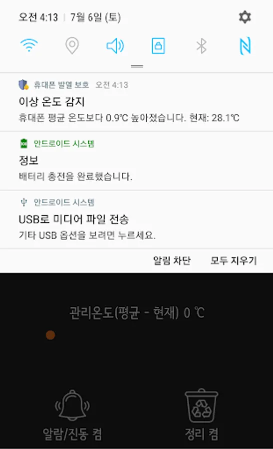 Heat alarm function of mobile phone -> Alarm occurs when the average temperature of the mobile phone is 8 degrees higher than the average temperature of the mobile phone.