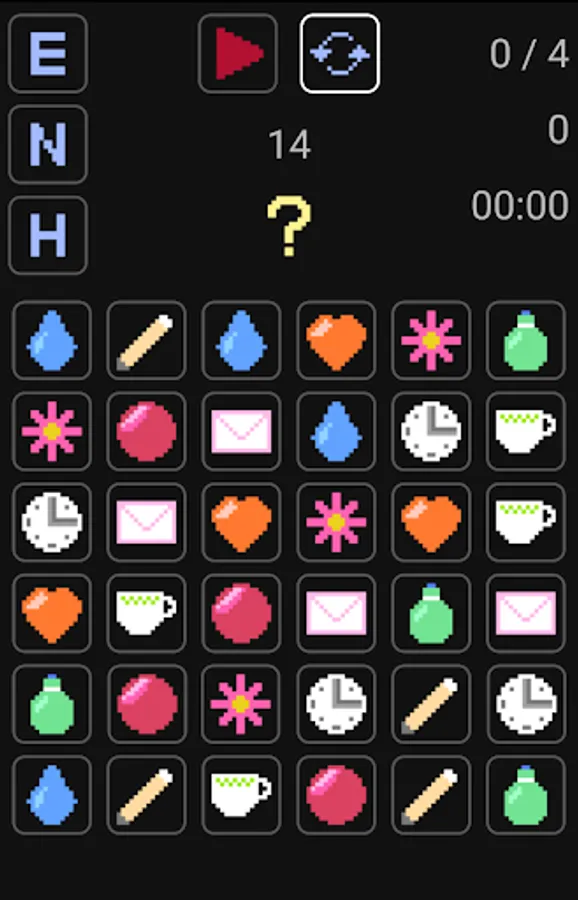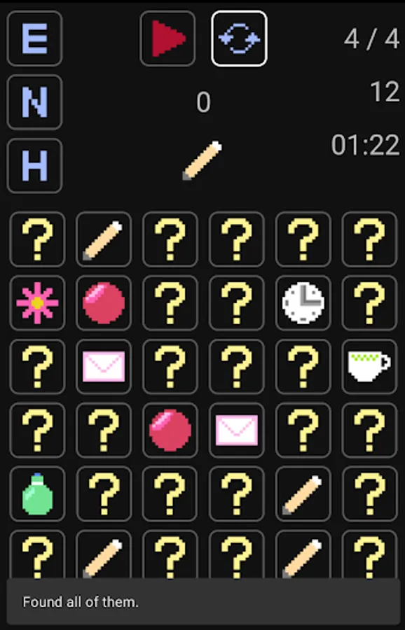 This game app challenges you to find 4 randomly presented items from 36 icons of 9 different types.