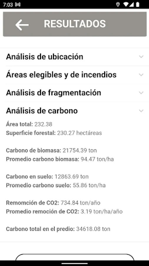 With this application, the owners of forest lands in the State of Jalisco can georeference their properties, using the GPS of their mobile phone, and obtain an estimate of the carbon stored in the soil, in the superficial biomass and the CO2e absorption potential. The application uses the Canopy Cover Density index, derived from Sentinel 2 satellite images, to estimate the remaining forest area of a property, and makes carbon calculations only on the actual forest area, since the covers used in the analysis are carried out using mathematical models of data obtained in previous years, it is necessary that the calculation be made on the current forest area of the property analyzed. In a complementary way, with the objective of having biodiversity criteria to evaluate the property, a fragmentation analysis is carried out, resulting in a table of degree of connectivity, and several geomorphometric indices are generated, such as slope and orientation, which will be useful in actions of conservation and restoration.