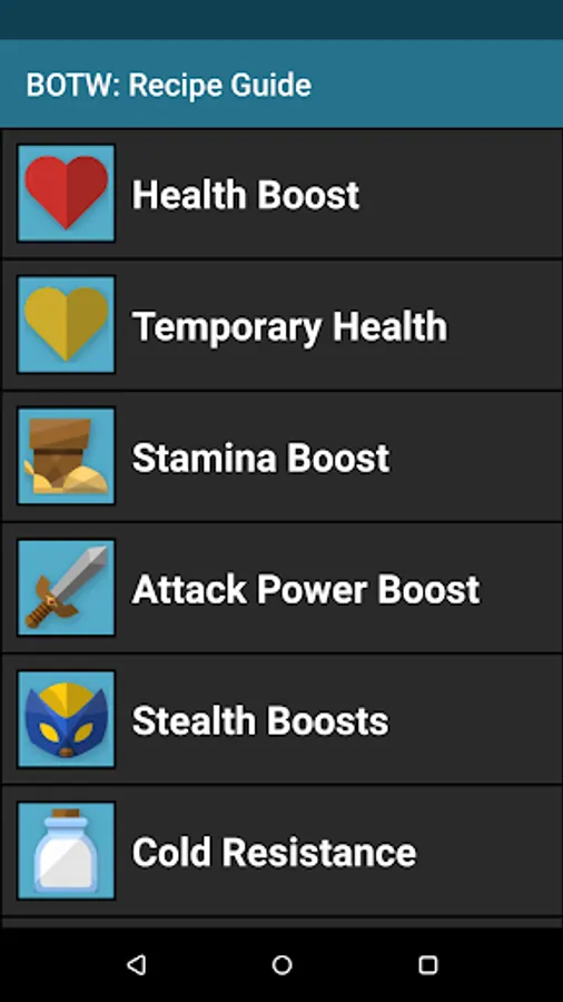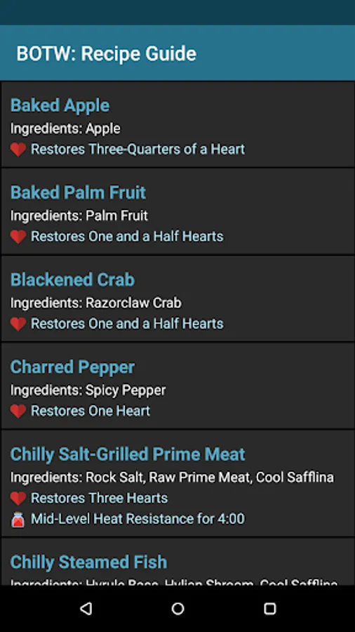 This app is a must have for any player of Zelda: Breath of the Wild. No longer will you aimlessly throw ingredients into the cooking pot and get a meal that doesn't satisfy. Using this app you can find which recipes work best and see what starts each will provide.