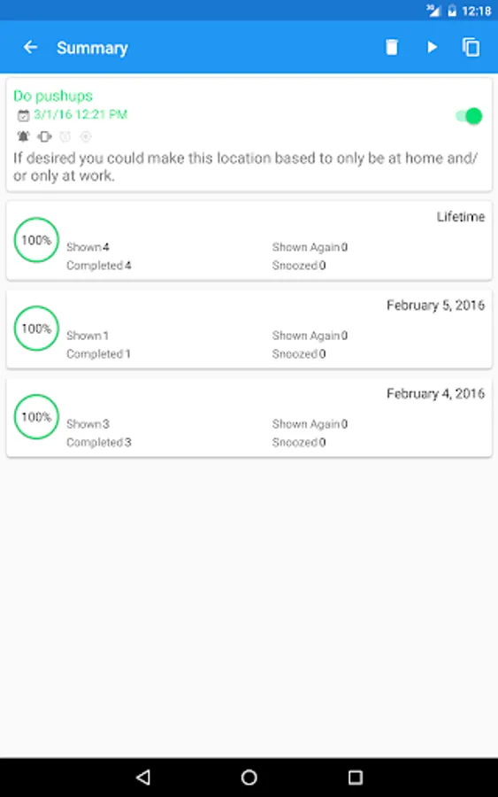 Track how well you follow your reminders with click vs. dismiss notification tracking. Check the reminder's summary page for all the statistics. Statistics are tracked on a per day basis along with lifetime tracking. Export the data as a .csv for analysis in a spreadsheet application.